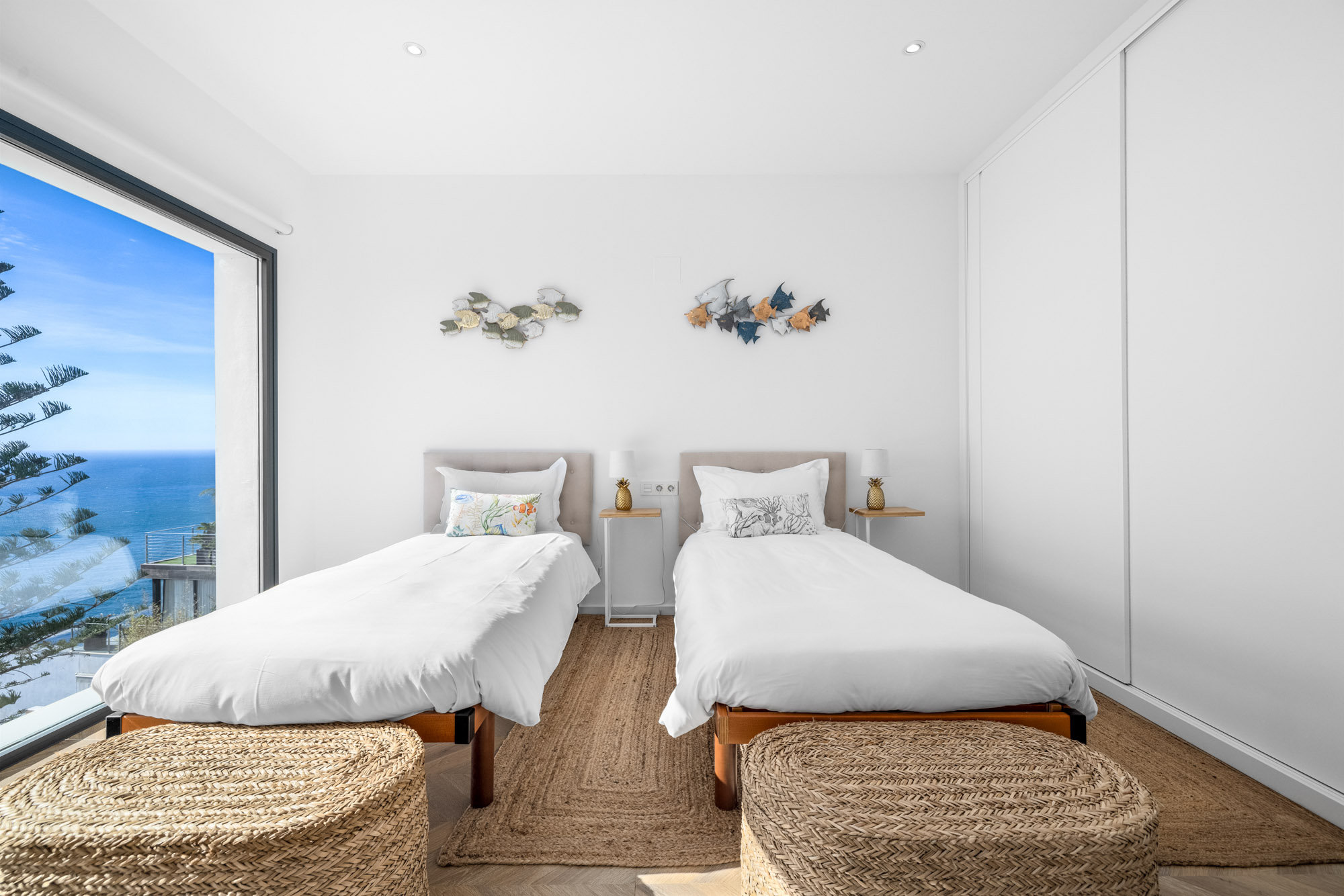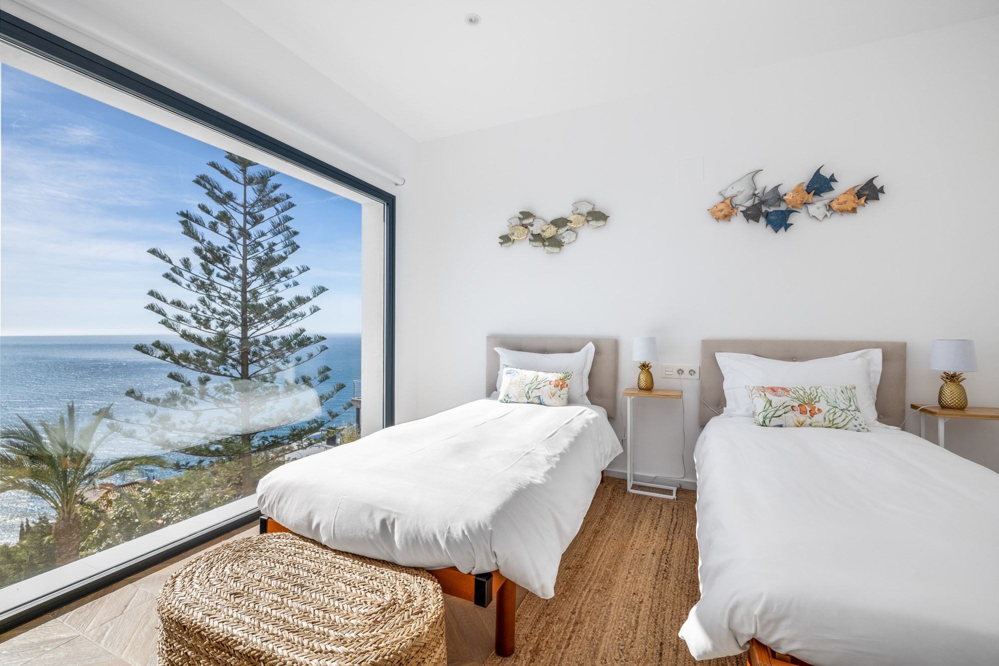 Guest Bedroom 4: Bedroom four is furnished with twin motorised adjustable beds (90 x 200 cm) which can be joined together with a love bridge to make a double, 2 bedside tables with quirky pineapple reading lamps, a Smart TV and a single fitted wardrobe.