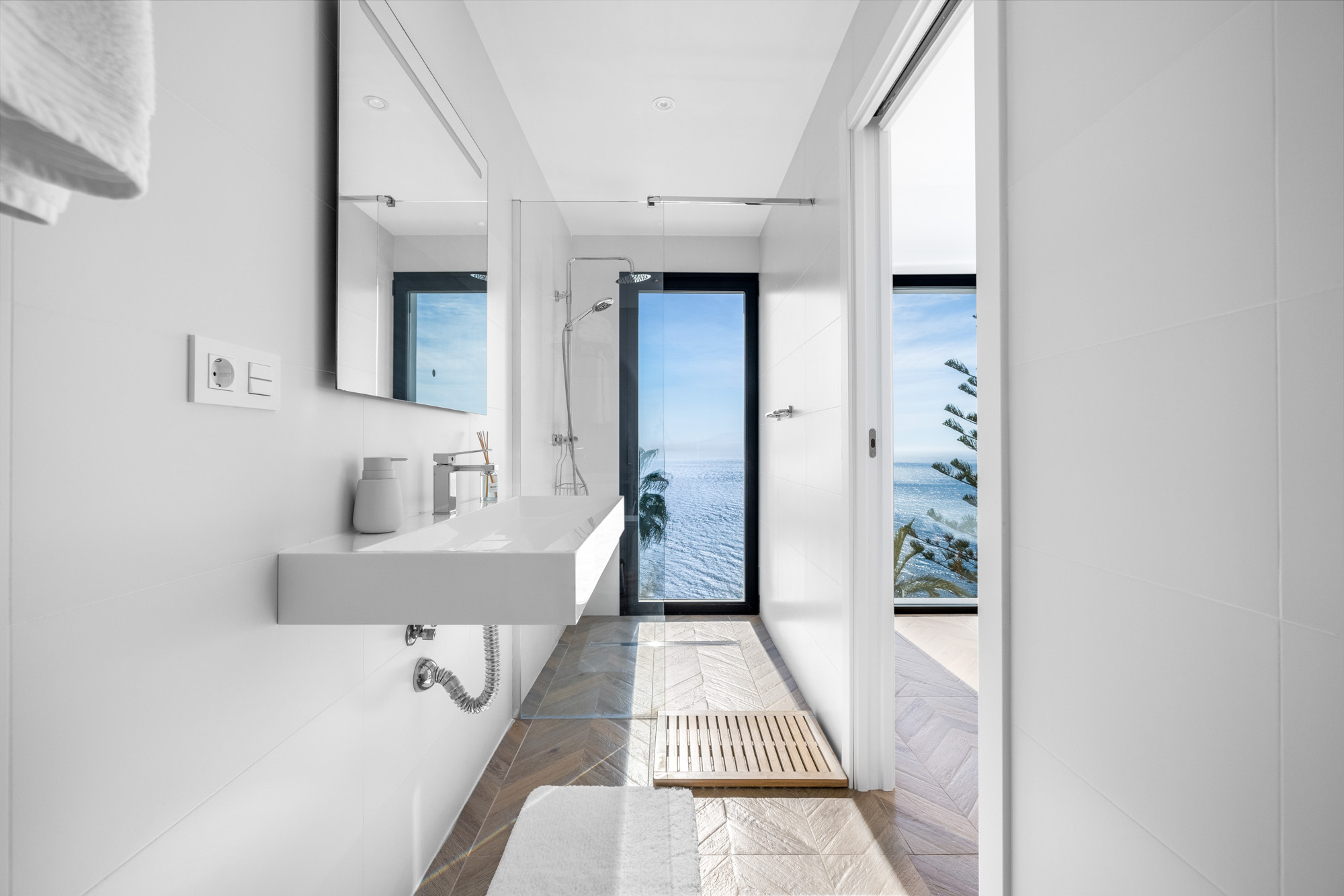 The en suite bathroom is equipped with a walk-in rain shower with a window that looks through the bedroom across to the sea view, single washbasin, LED light mirror and toilet.