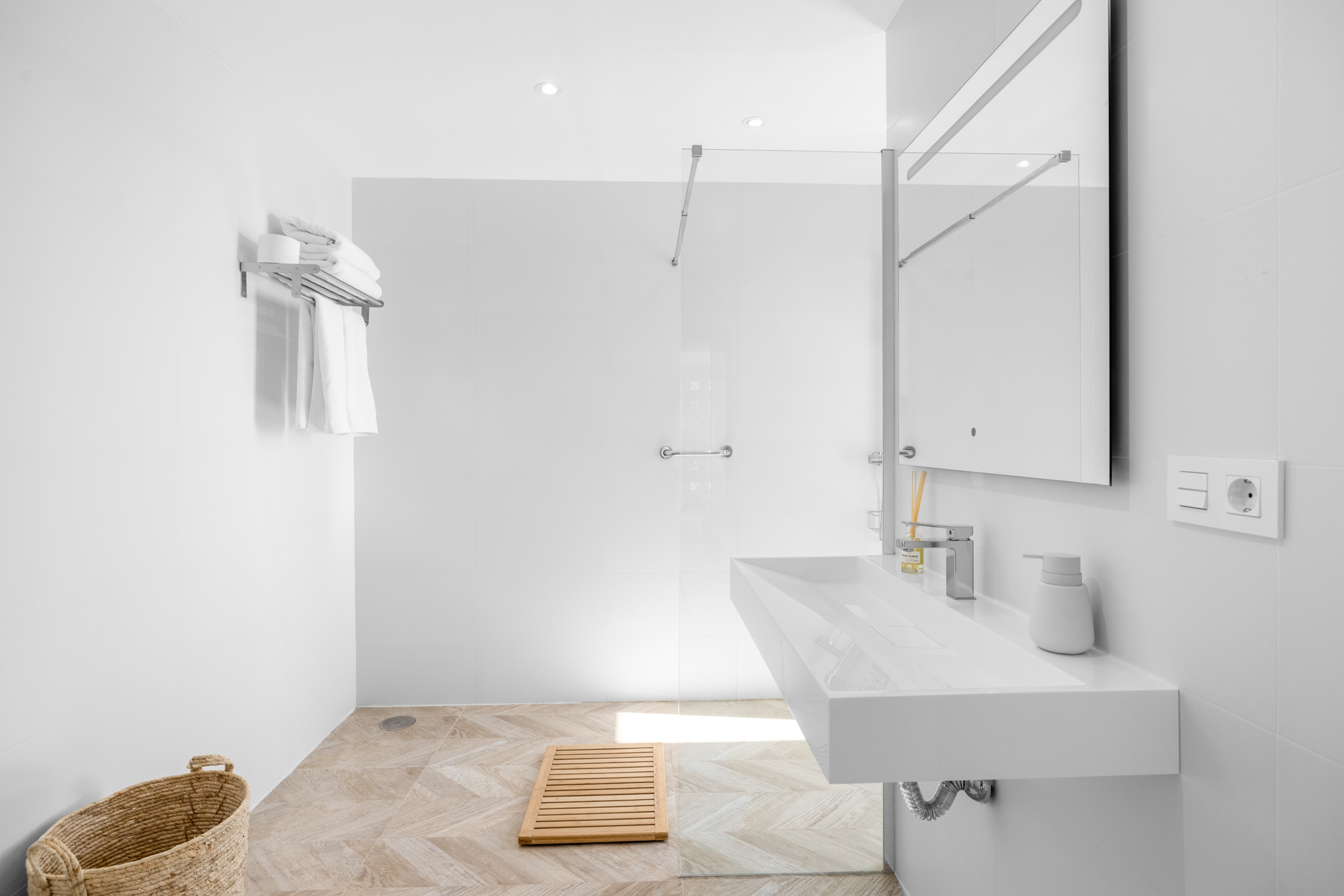 The en suite bathroom is equipped with a walk-in rain shower with sea view window, single washbasin, LED light mirror and toilet.