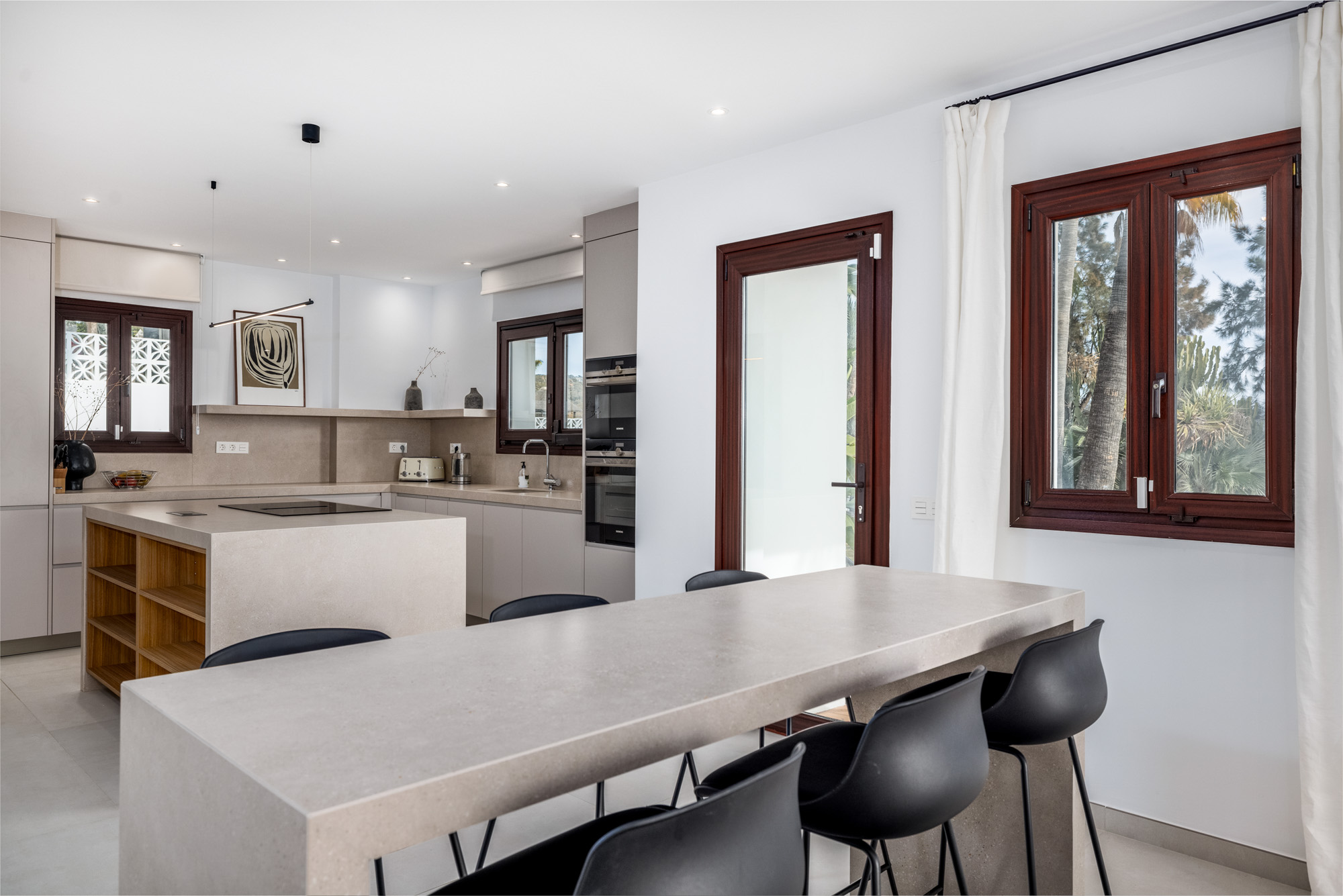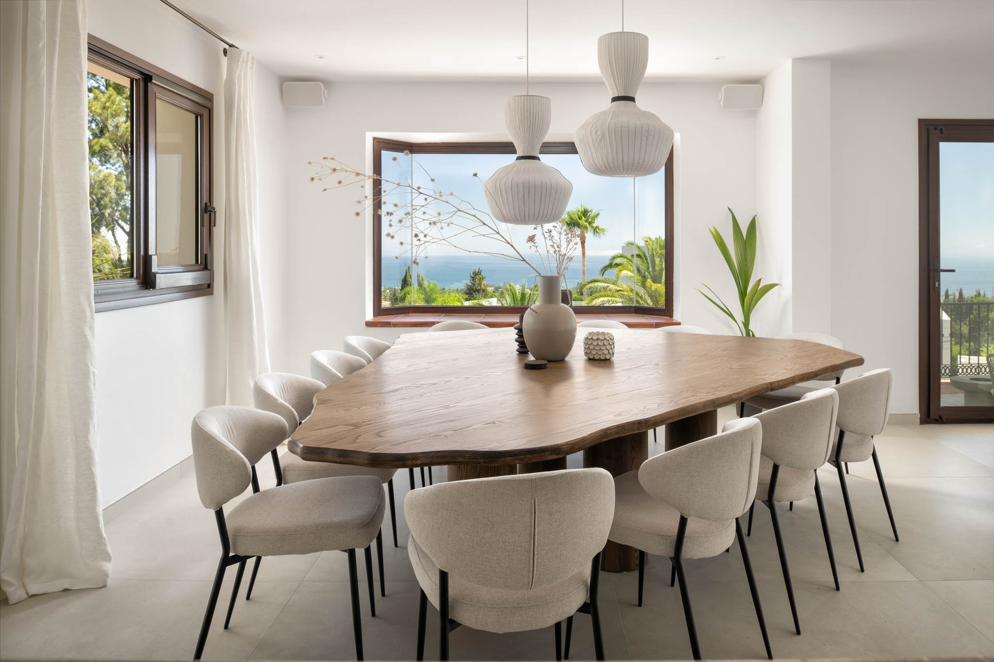 The modern custom-made kitchen is open-plan to the dining area with its unique three-sided dining table to seat 12 guests. Enjoy sea views and direct access to the main terrace.