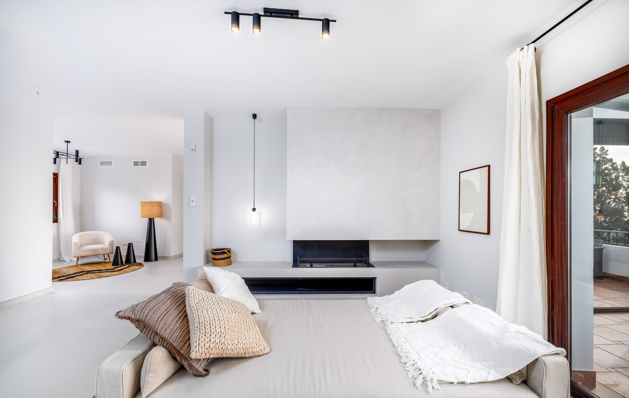 Full-length glass doors lead out to the terrace with those fabulous sea views. At the entrance to the bedroom is a sitting area with a double day bed and a bioethanol fireplace.