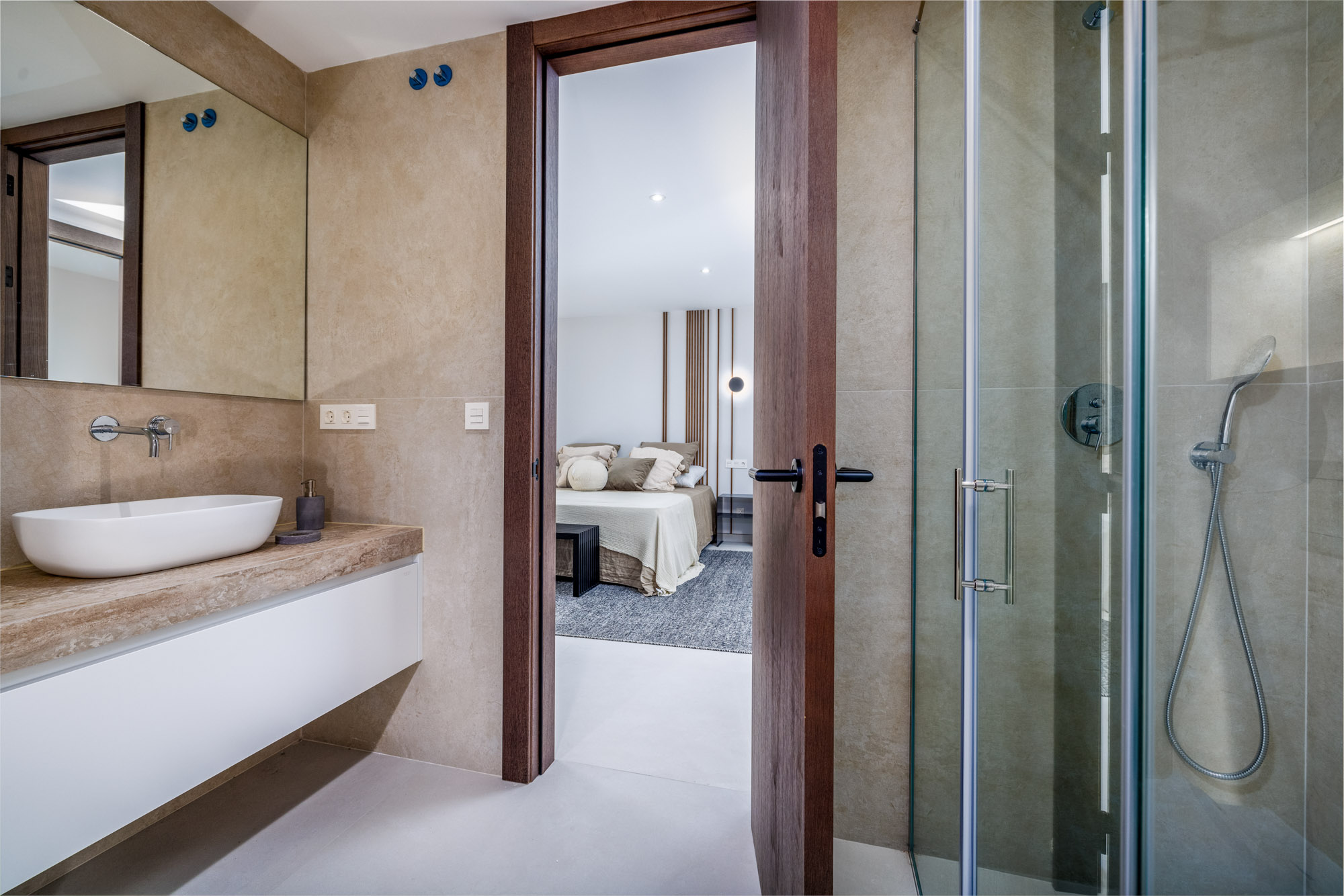 The en-suite bathroom is equipped with a walk-in rain shower, a single wash basin with cabinet underneath and a WC. Adjacent to this bathroom is a sauna and shower area.