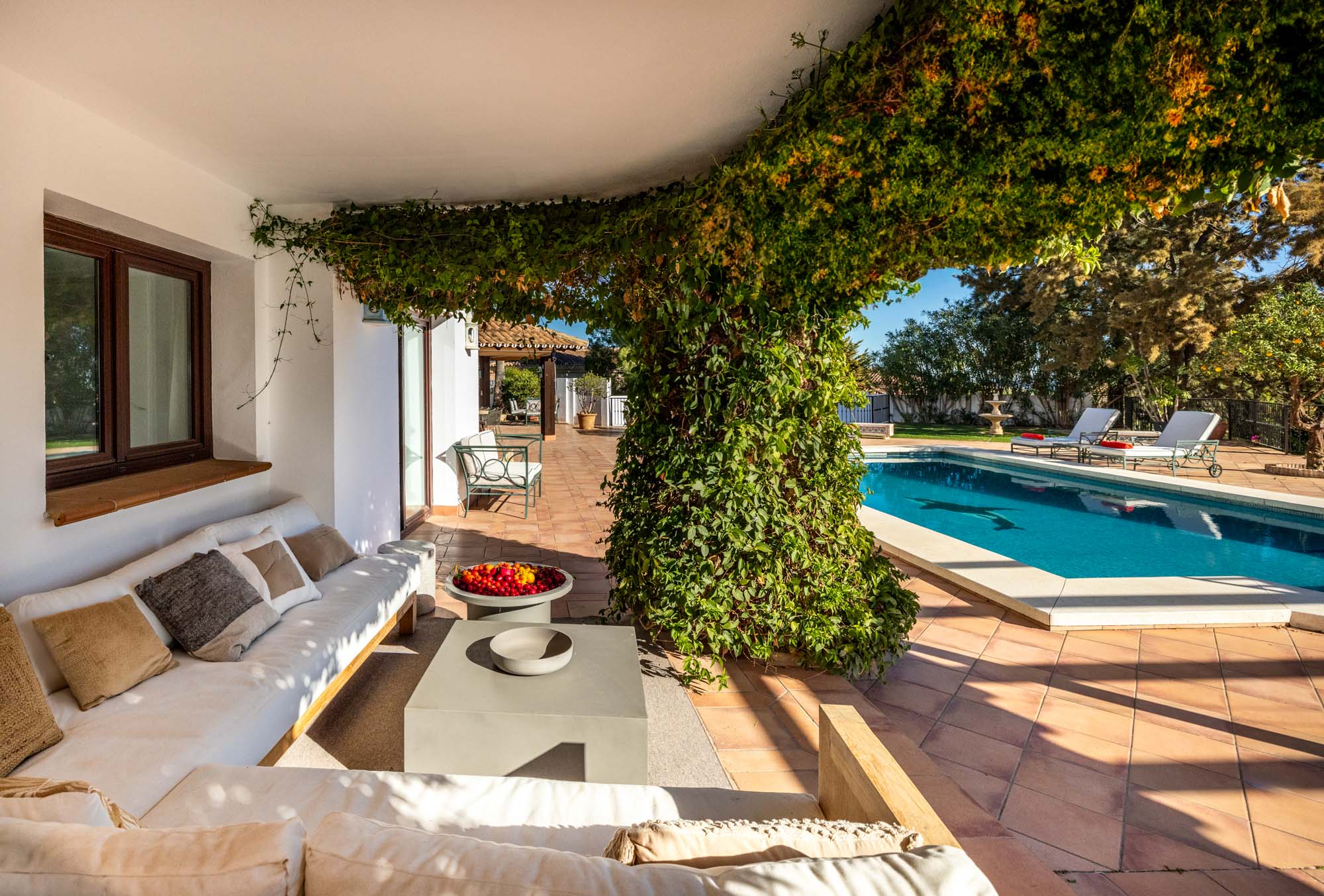 The shaded lawn is the perfect spot when you want to escape the blistering summer sun or simply float on the pool with the immense Mediterranean canopy and swaying palms overhead.