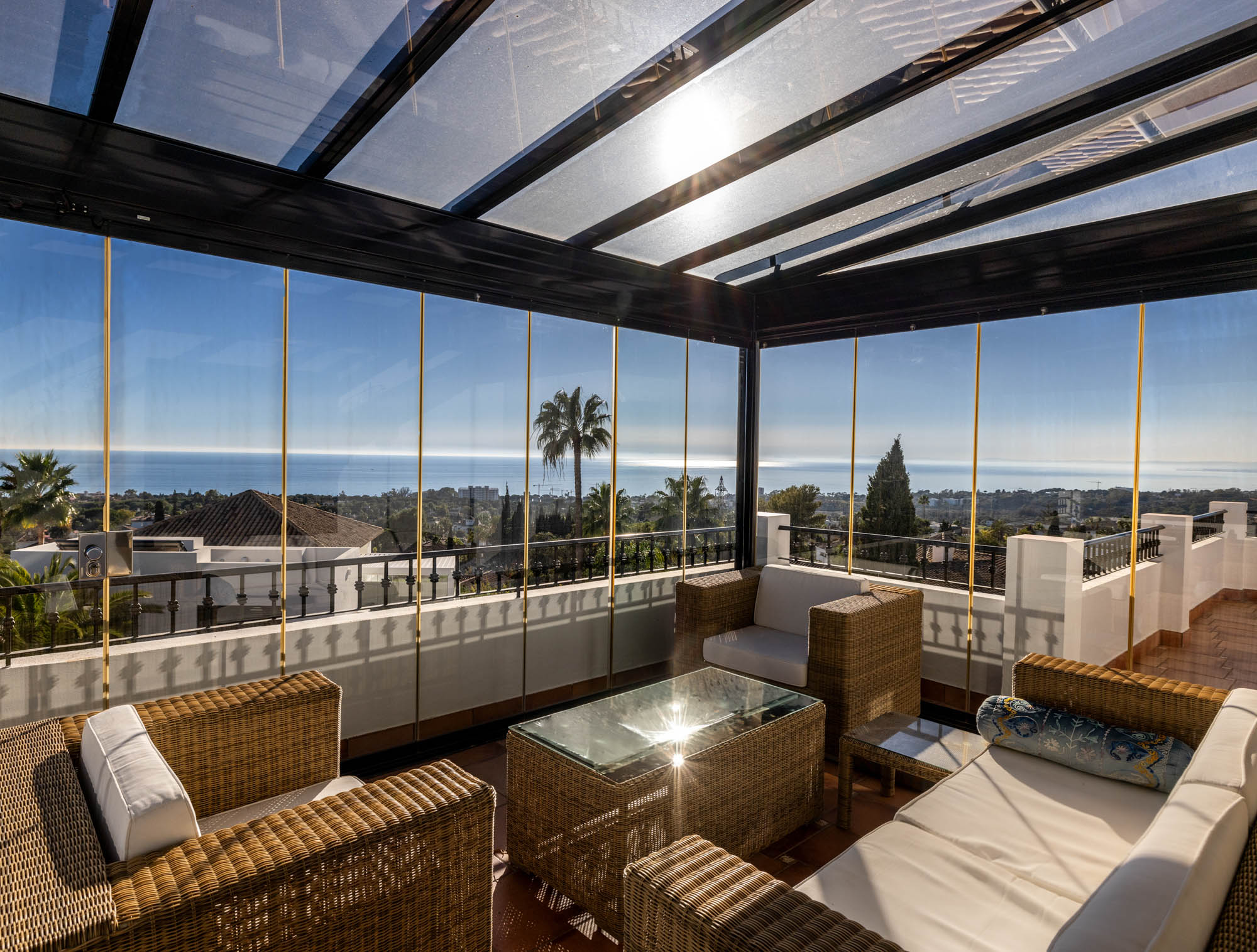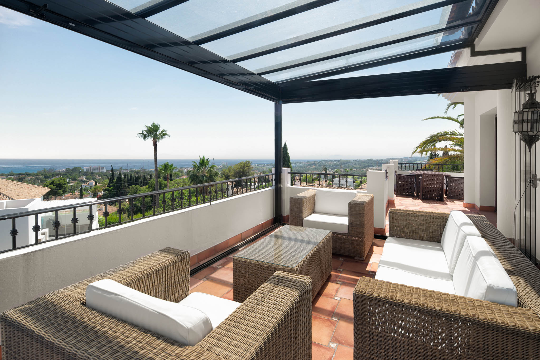 First floor full-width terrace with glass curtains around the central sitting area, perfect for all-year-round stays.