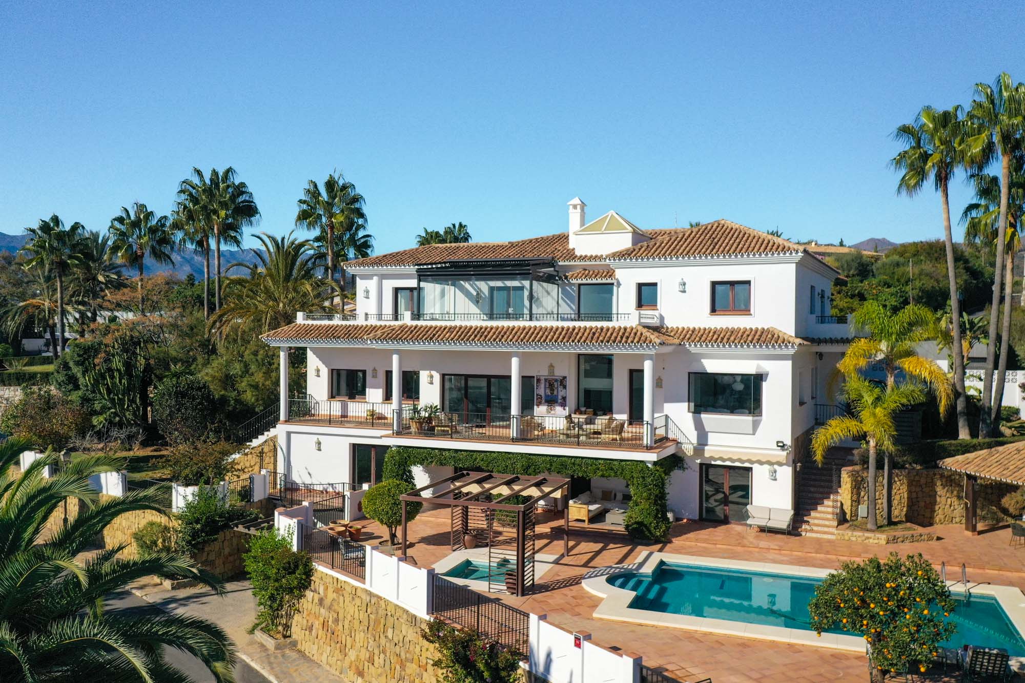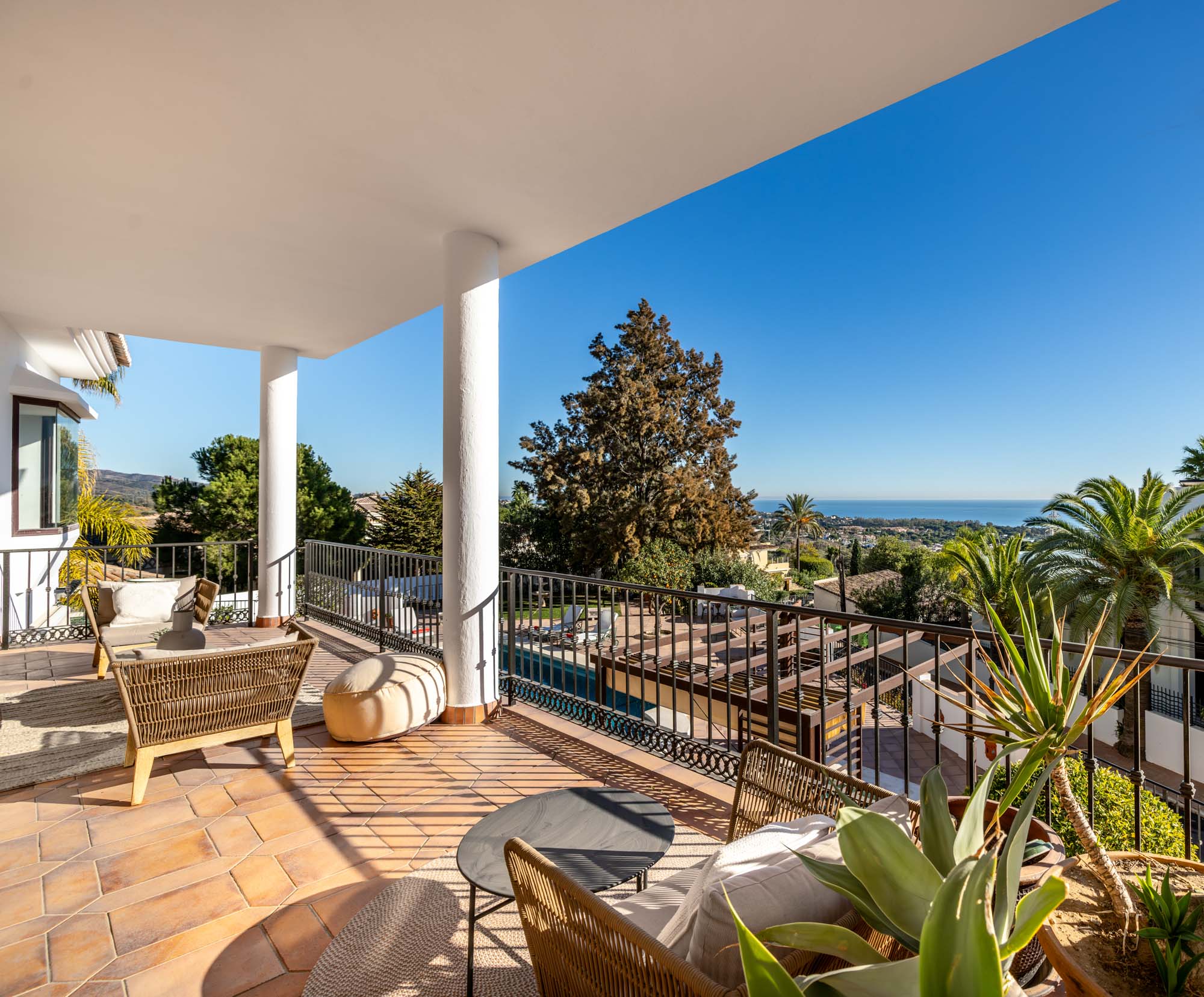 Beautifully presented, 6 bedroom Villa Mae is a newly upgraded, spacious modern luxury villa in the peaceful suburbs of El Rosario, east Marbella. With sea views, it's close to one of the Costa del Sol’s best golden sand beaches and just 10 minutes to the centre of Marbella.