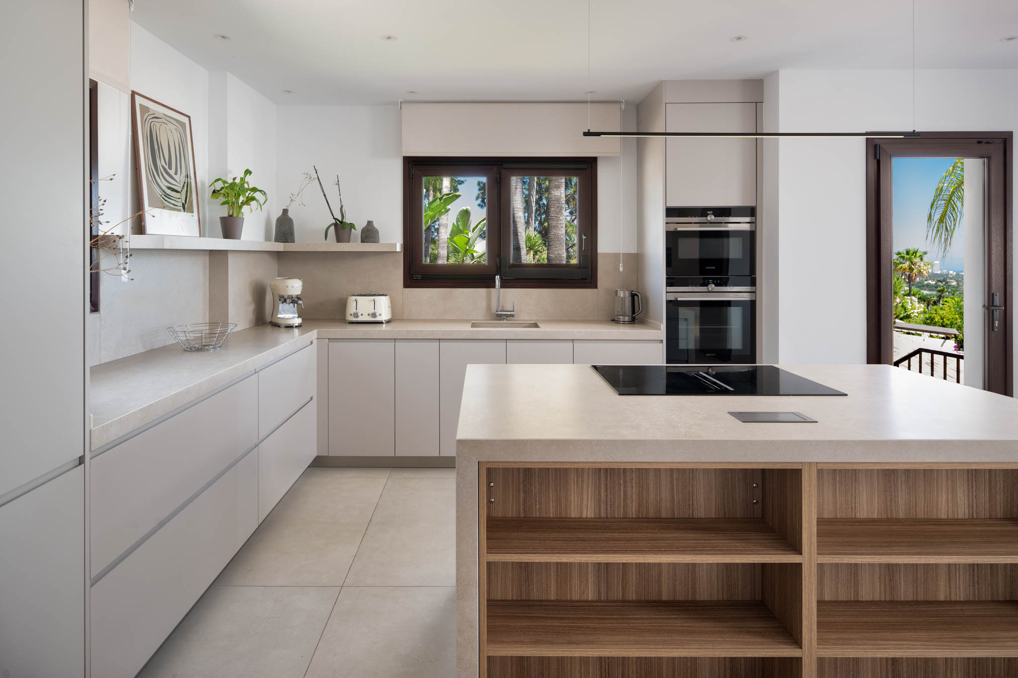Custom-made kitchen in natural matt quartz with ceramic countertops, hidden units, Siemens oven and separate grill, island hob, toaster, kettle, coffee machine