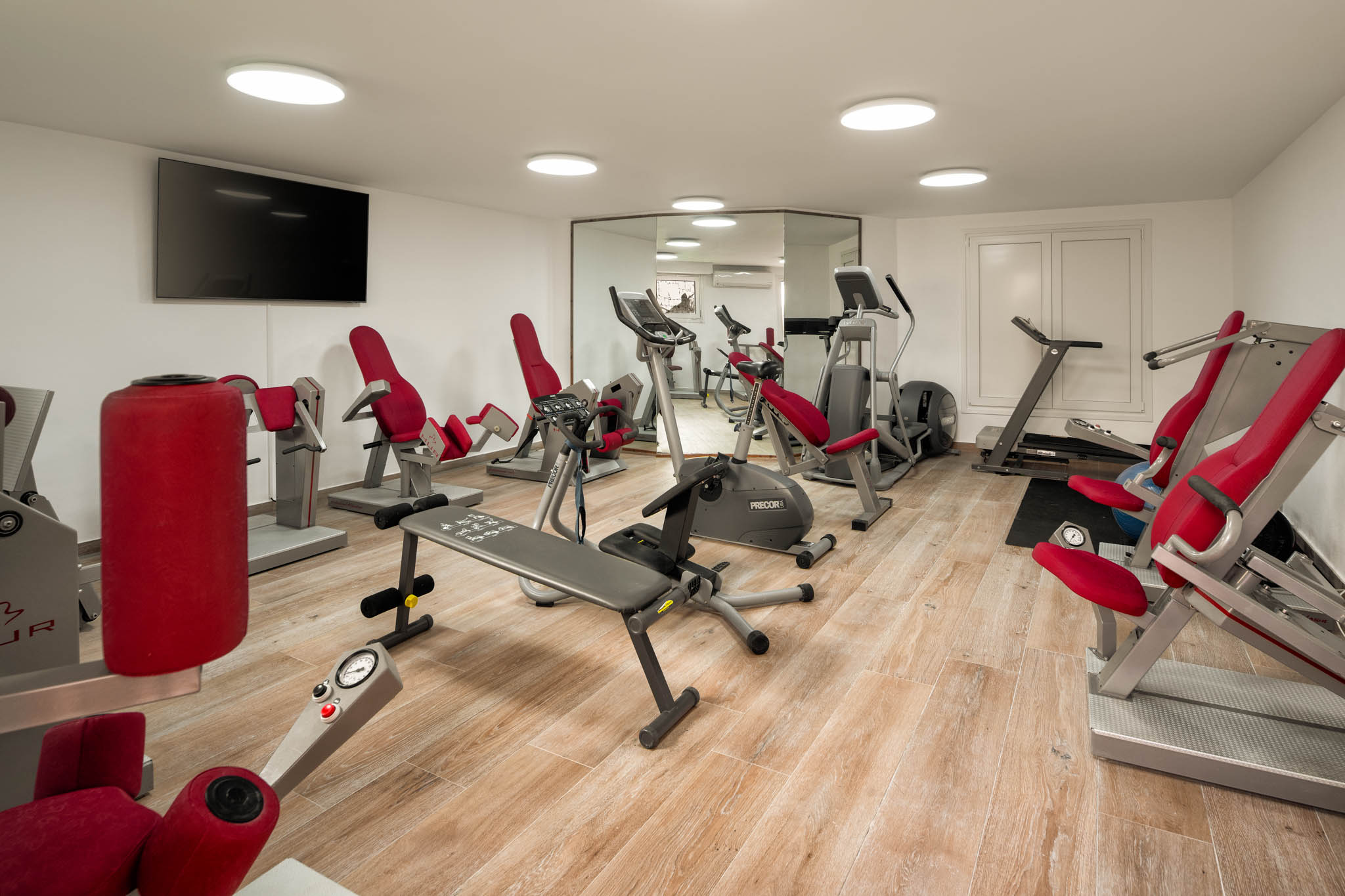 Private gym with cardio and resistance training machines by Hur and Precor, medicine ball and weights.