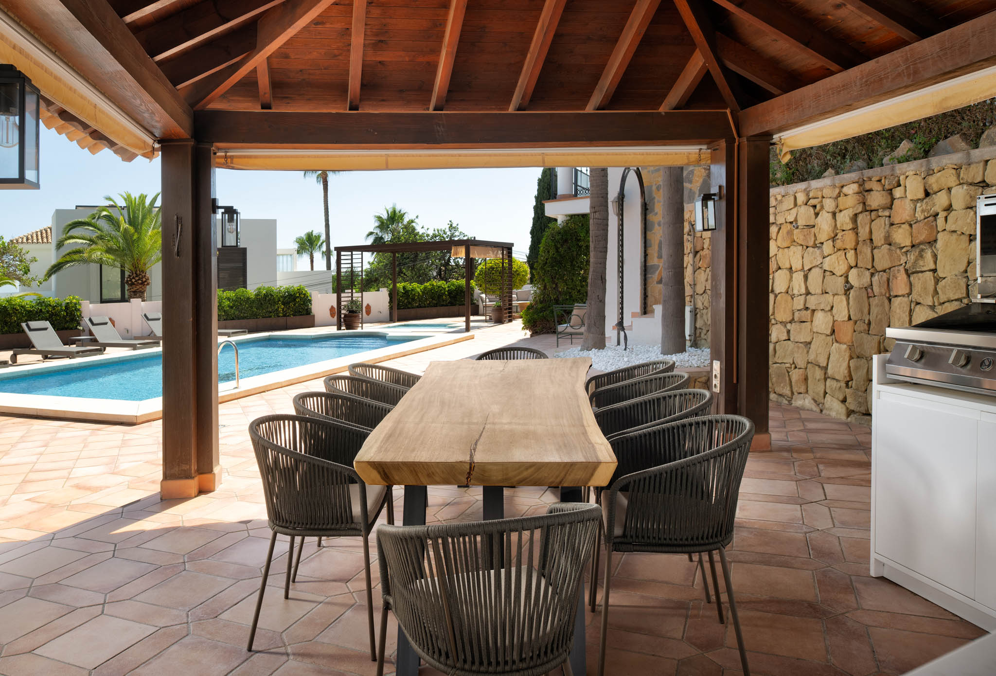 Enjoy a BBQ in the summer dining room, or have the chef cook a giant poolside paella while you relax.