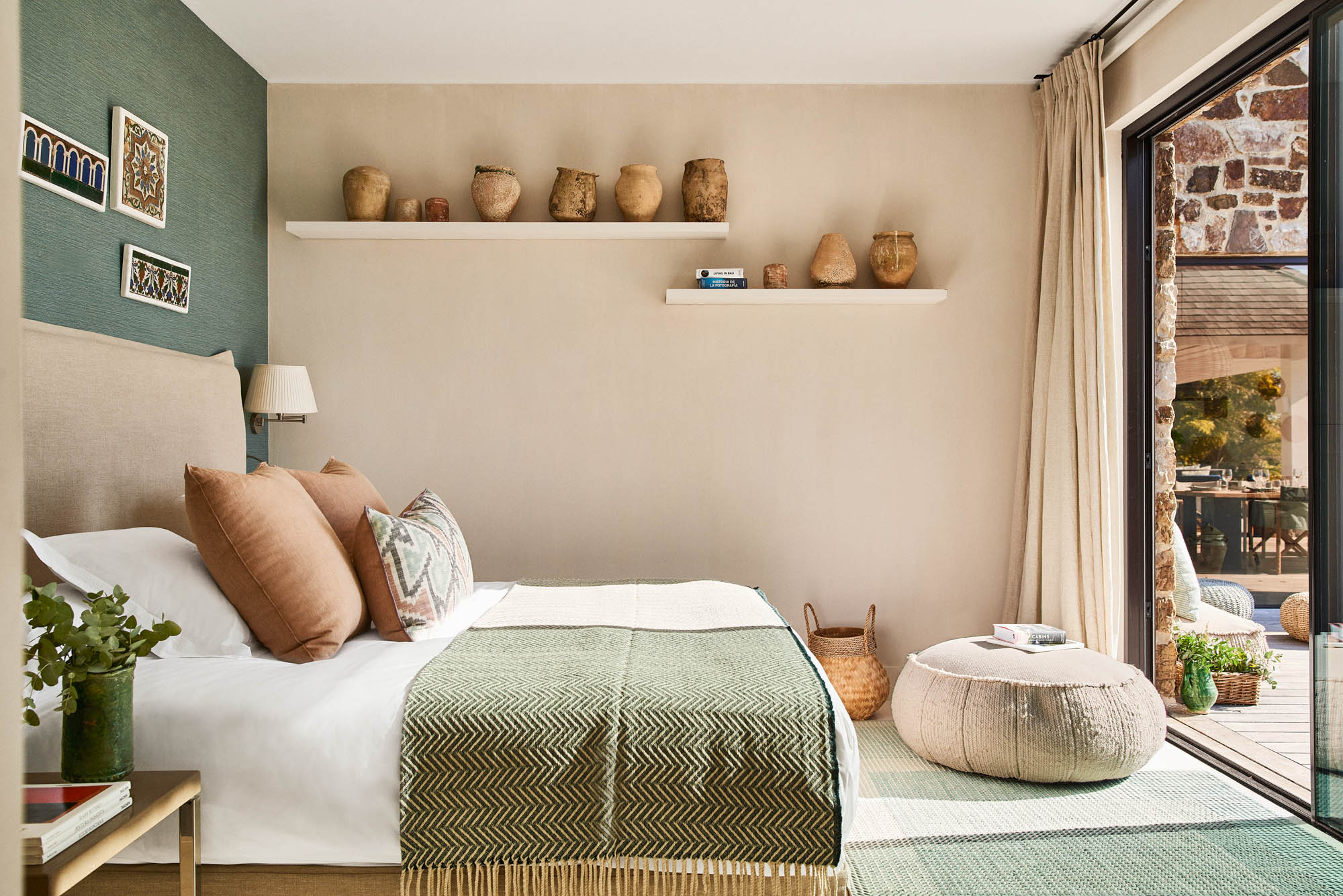 Garden Bedroom 4: Independent access from the main outdoor living areas, this bedroom offers a comfortable and private setting close to the heart of the garden. A king-size bed (180cm x 200cm) with a stone linen headboard is paired with soft duck-egg blue accents and a coordinating rug. The room includes built-in wardrobes, cream wall-mounted bedside lamps and a small circular pouffe.