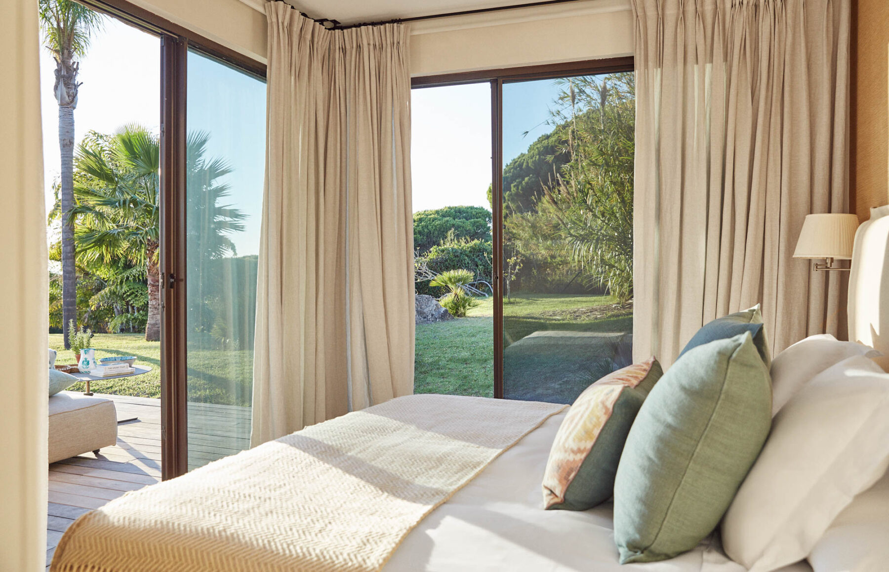 Sliding glass doors open directly onto the gardens, allowing for an easy flow between indoor and outdoor living and reinforcing the sense of calm continuity that characterises the villa.