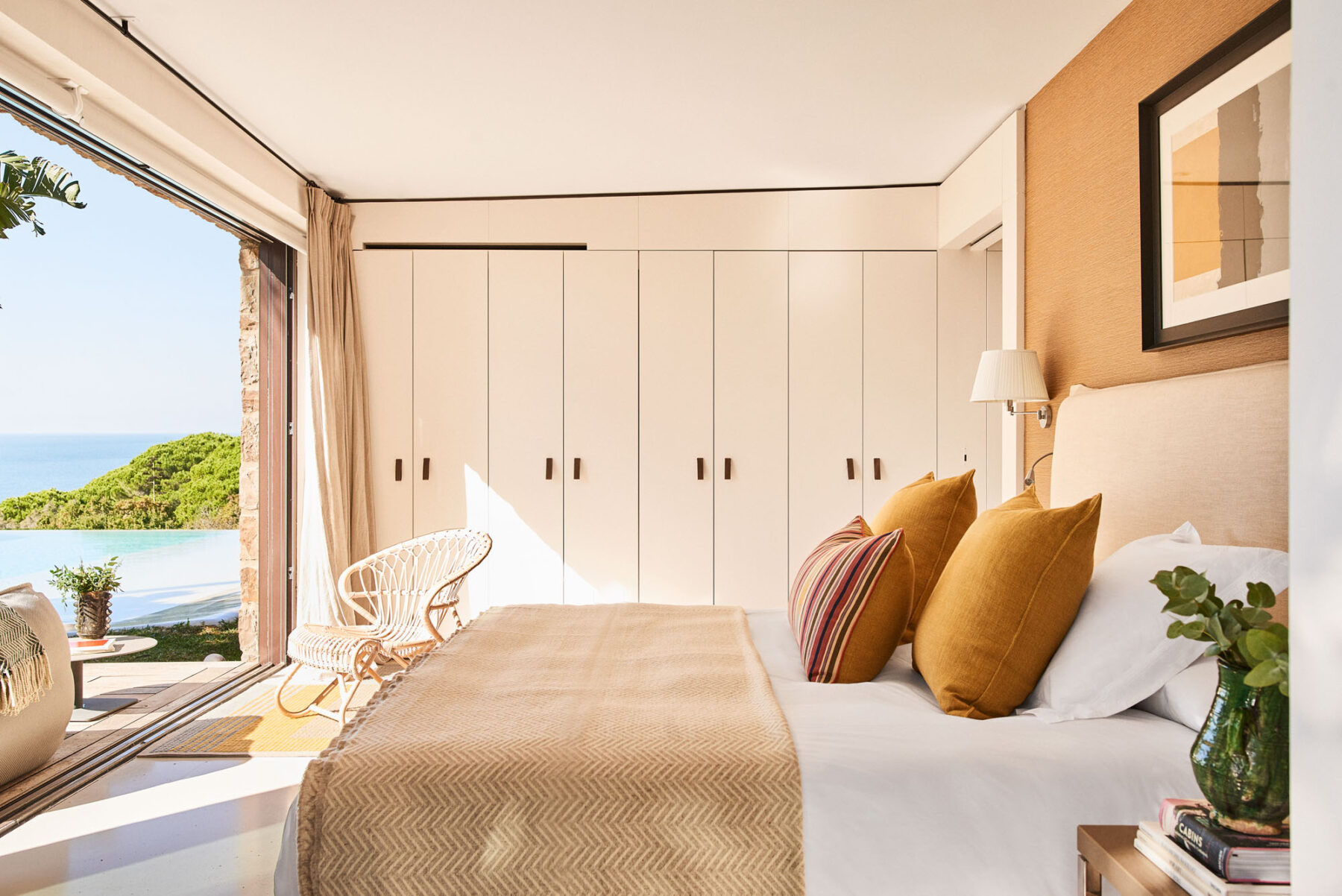 Garden Bedroom 5: Independent access from the main outdoor living areas, This bright and airy bedroom features a king-size bed (180cm x 200cm) with a linen headboard, positioned against a gold-toned textured feature wall. Soft terracotta and green accents complement the room’s dual-aspect sea views. Built-in wardrobes provide ample storage.
