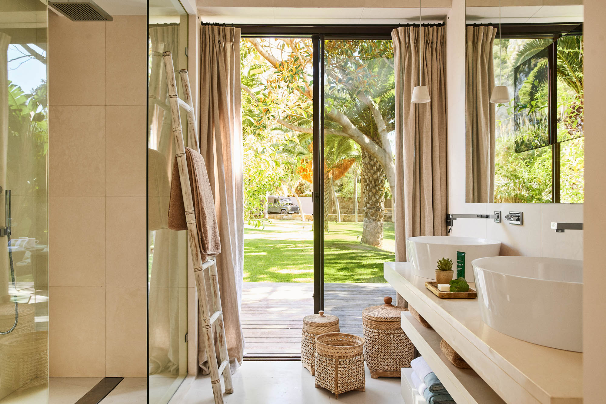 The spacious en-suite bathroom features twin basins with storage shelving, a double rain shower with handheld shower heads, separate WC and refined amenities by Natura Bissé and Votary. Practical touches include a towel ladder, yoga mats and beach accessories, making this suite particularly well suited to longer stays.
