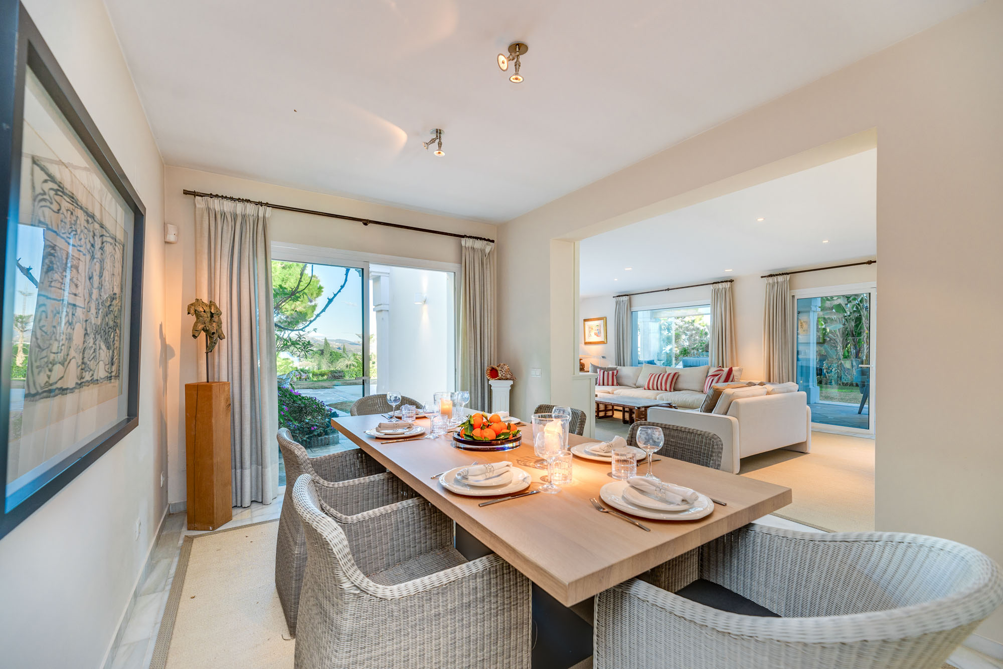 Terrace doors from here lead out to the main dining terrace with an eight seater round dining table and the Argentinian-style charcoal BBQ.