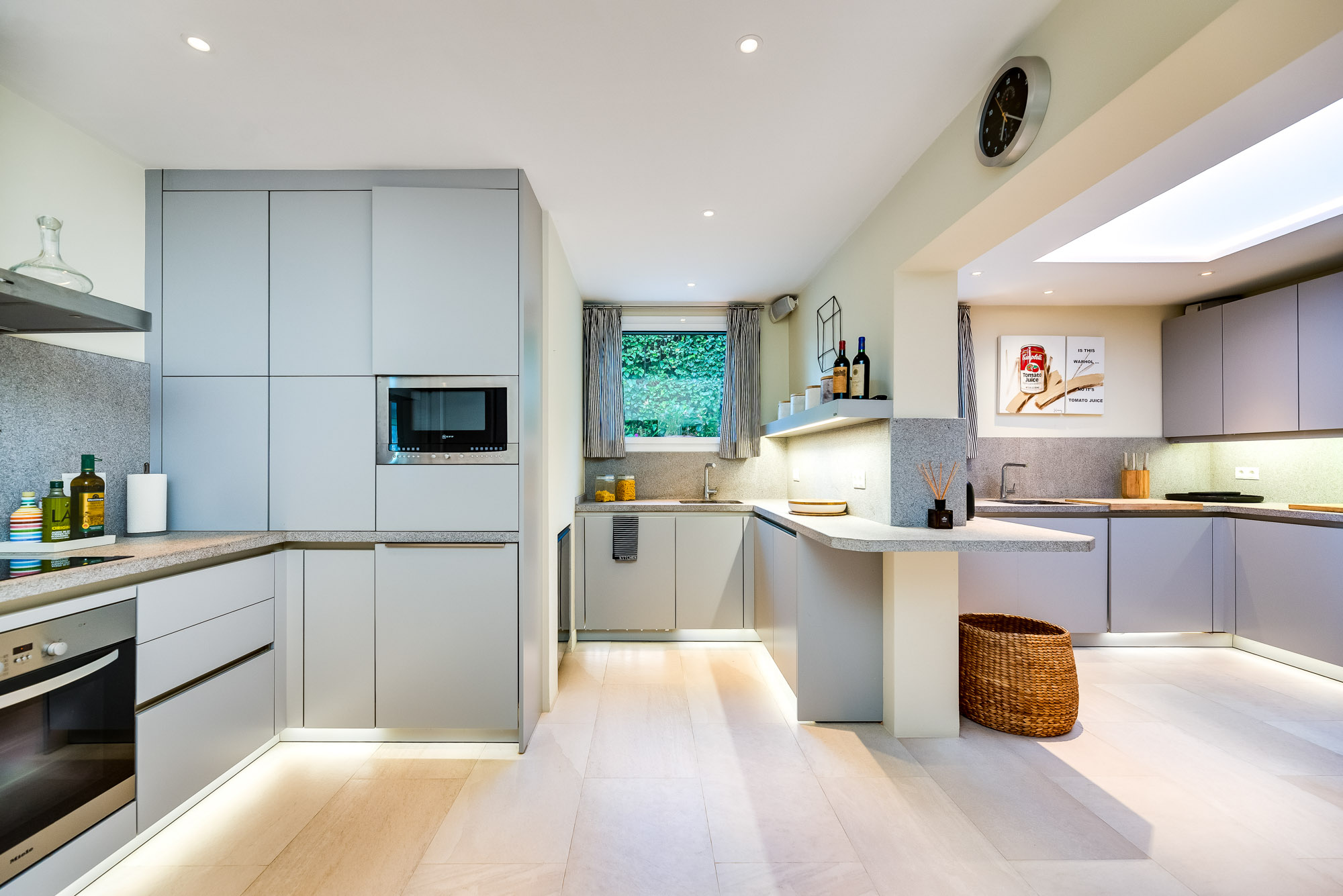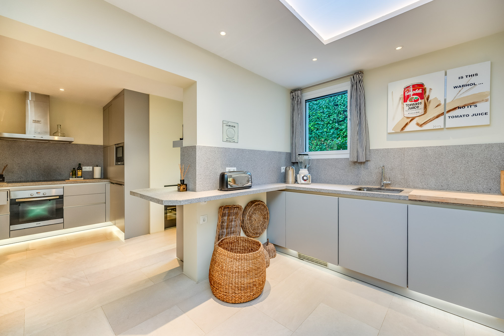 The double aspect kitchen at Villa Marilu is exceptional. Contemporary in design with plenty of counter prep space and fully equipped with high qualities accessories: two sinks, a state-of-the-art wine cooler, a large fridge freezer with a built-in ice machine, oven and electric hob, a coffee machine, food mixer, and all standard amenities to make preparing meals during your stay a breeze.
