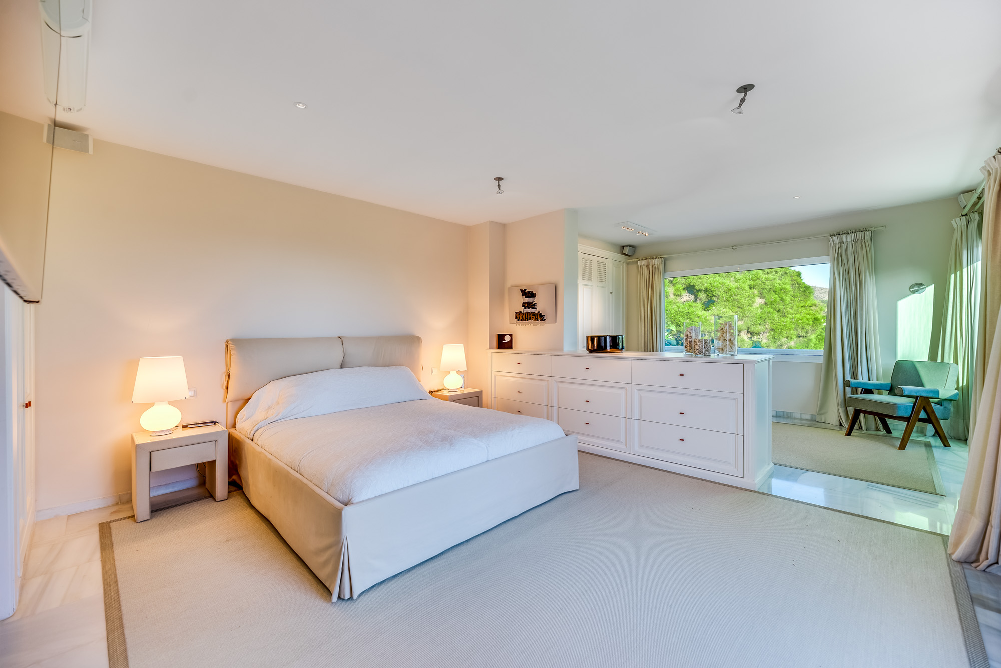 Principal Bedroom 1: The principal bedroom occupies the entire first (top) floor offering a good level of privacy. It’s spacious and bright, with a lovely wraparound terrace which enjoys uninterrupted views to the coast and Marbella town.