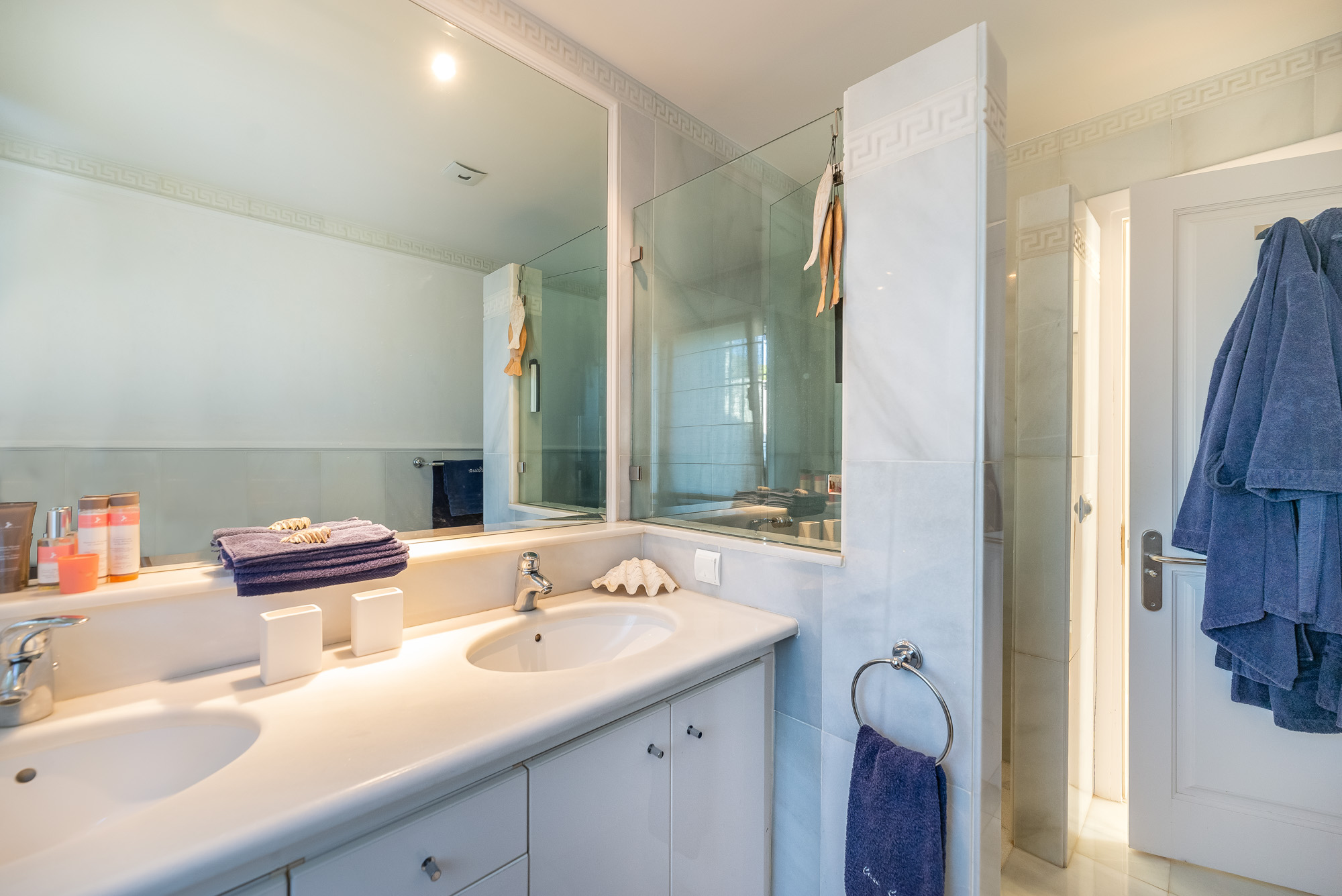 The shared bathroom is equipped with a walk-in shower, double wash basin and WC.