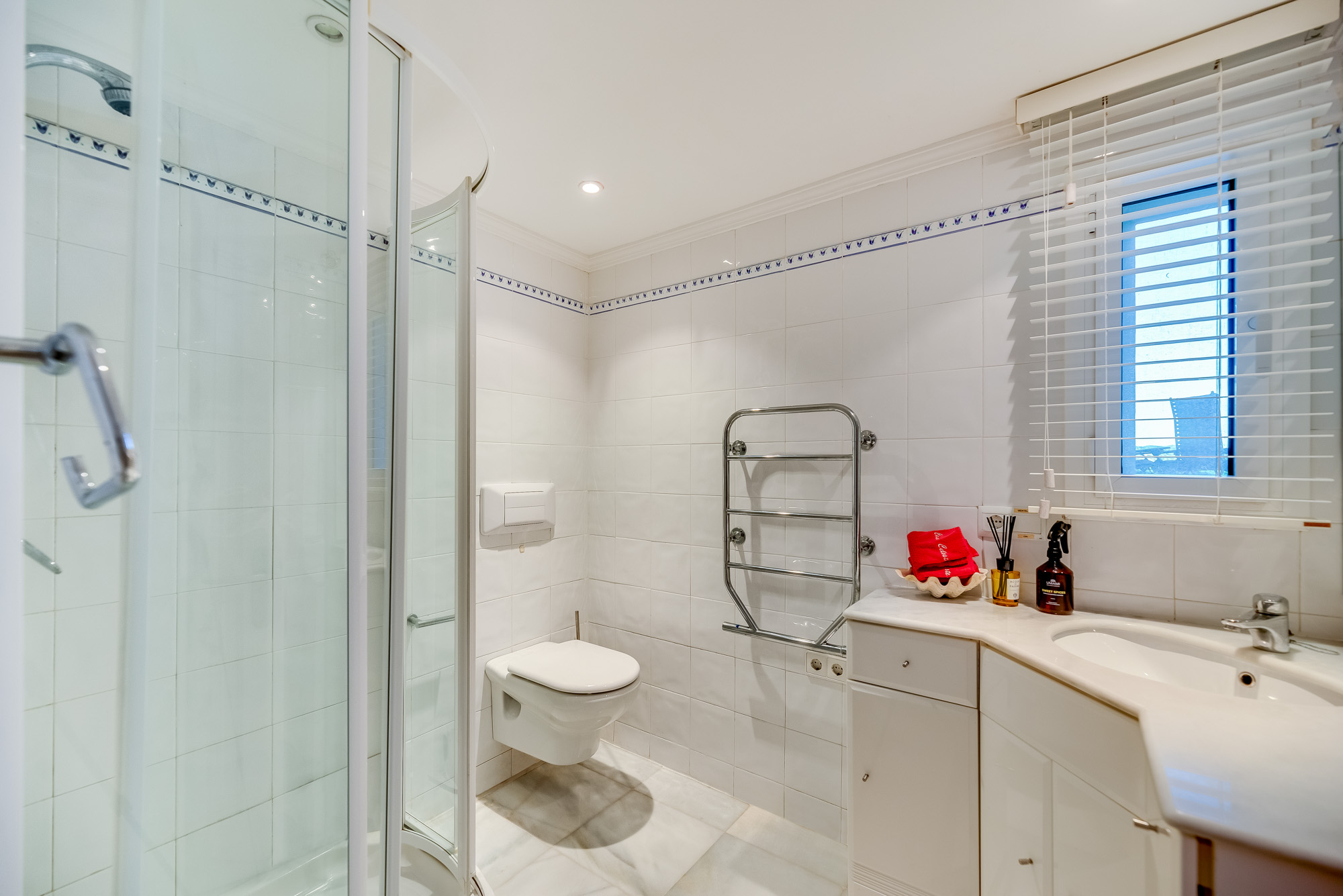 The bathroom next to the bedroom is equipped with a semi-circular walk-in shower, single wash basin, heated towel rail and a WC.