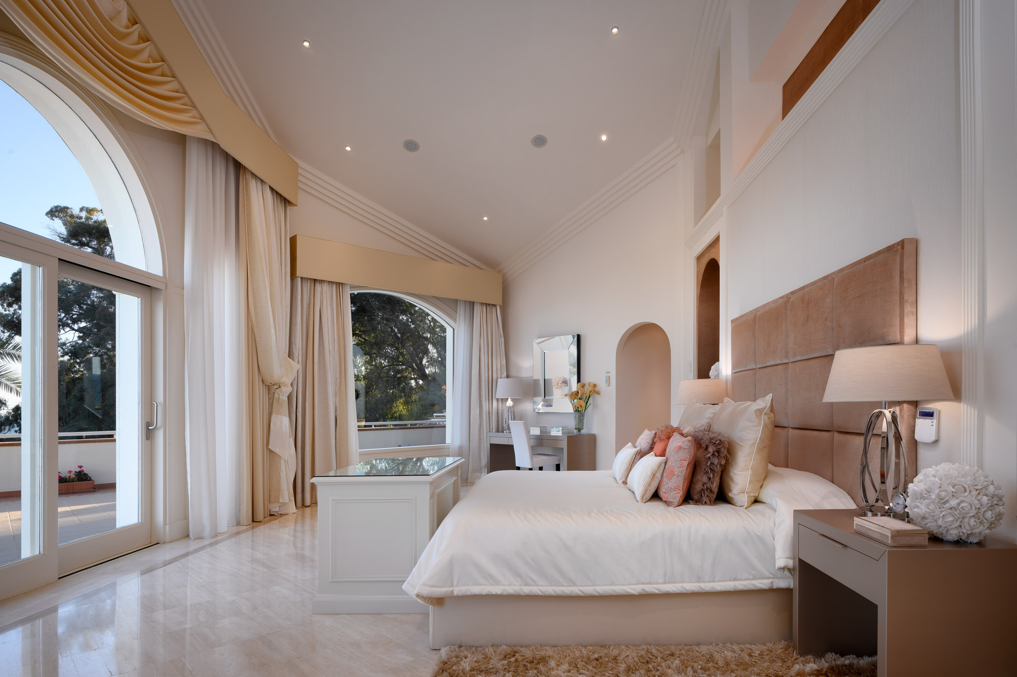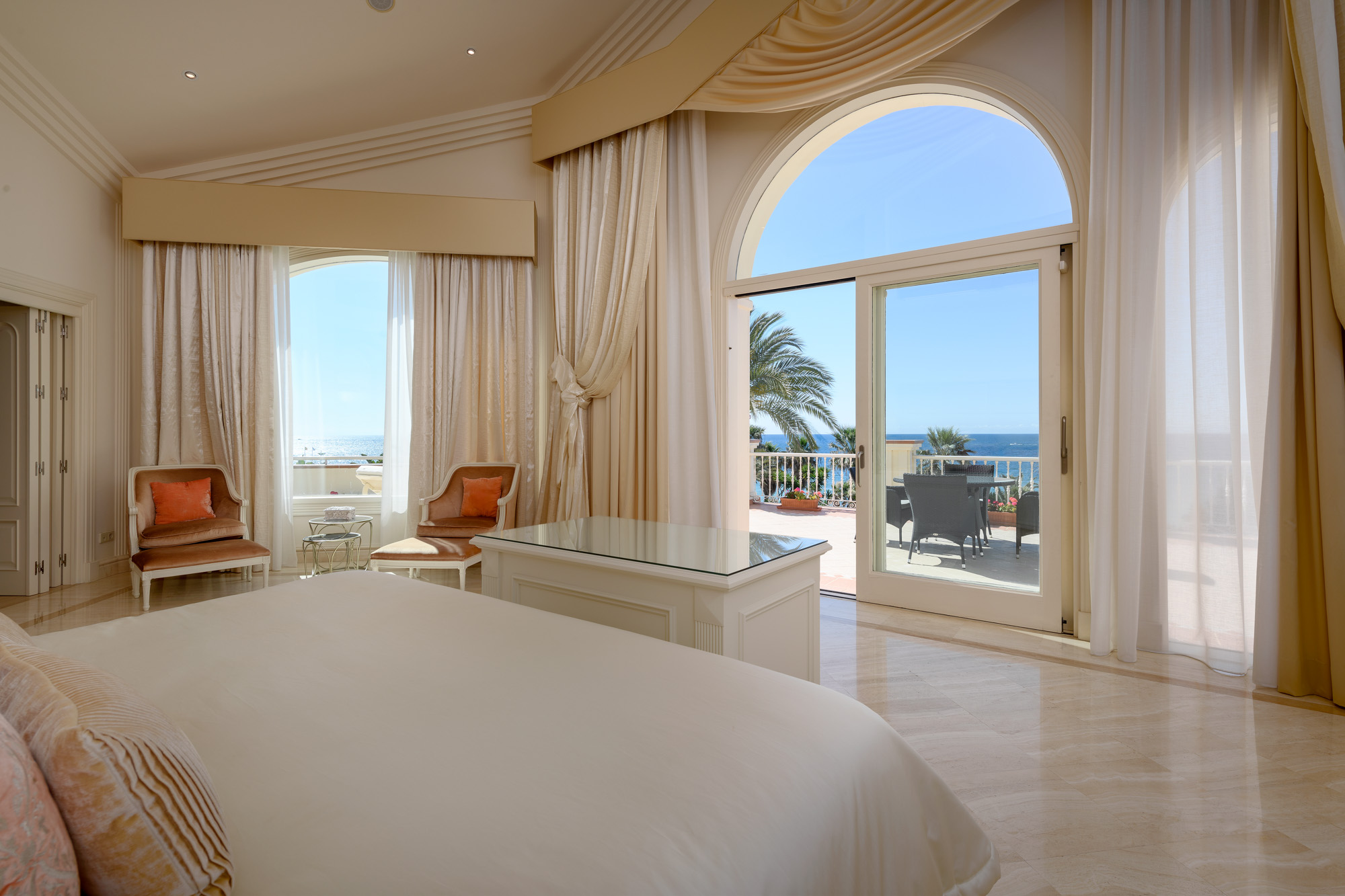 The top floor principal bedroom suite evokes an air of a glamorous 1950’s film set, with a wall of arched windows leading out to a magnificent terrace with dazzling views towards the Moroccan coast.