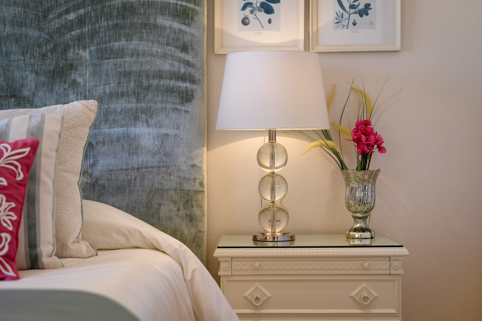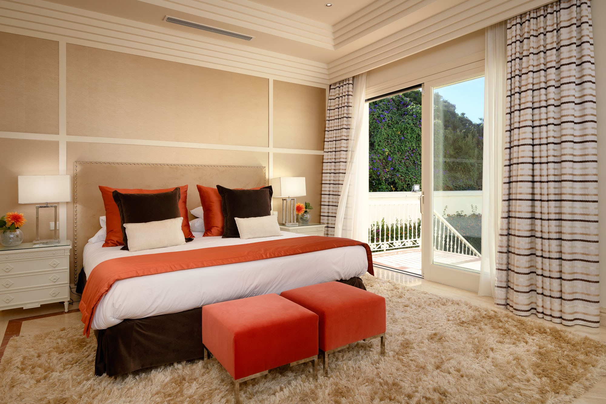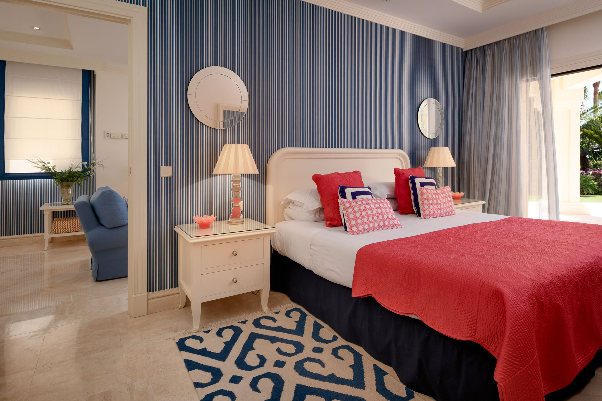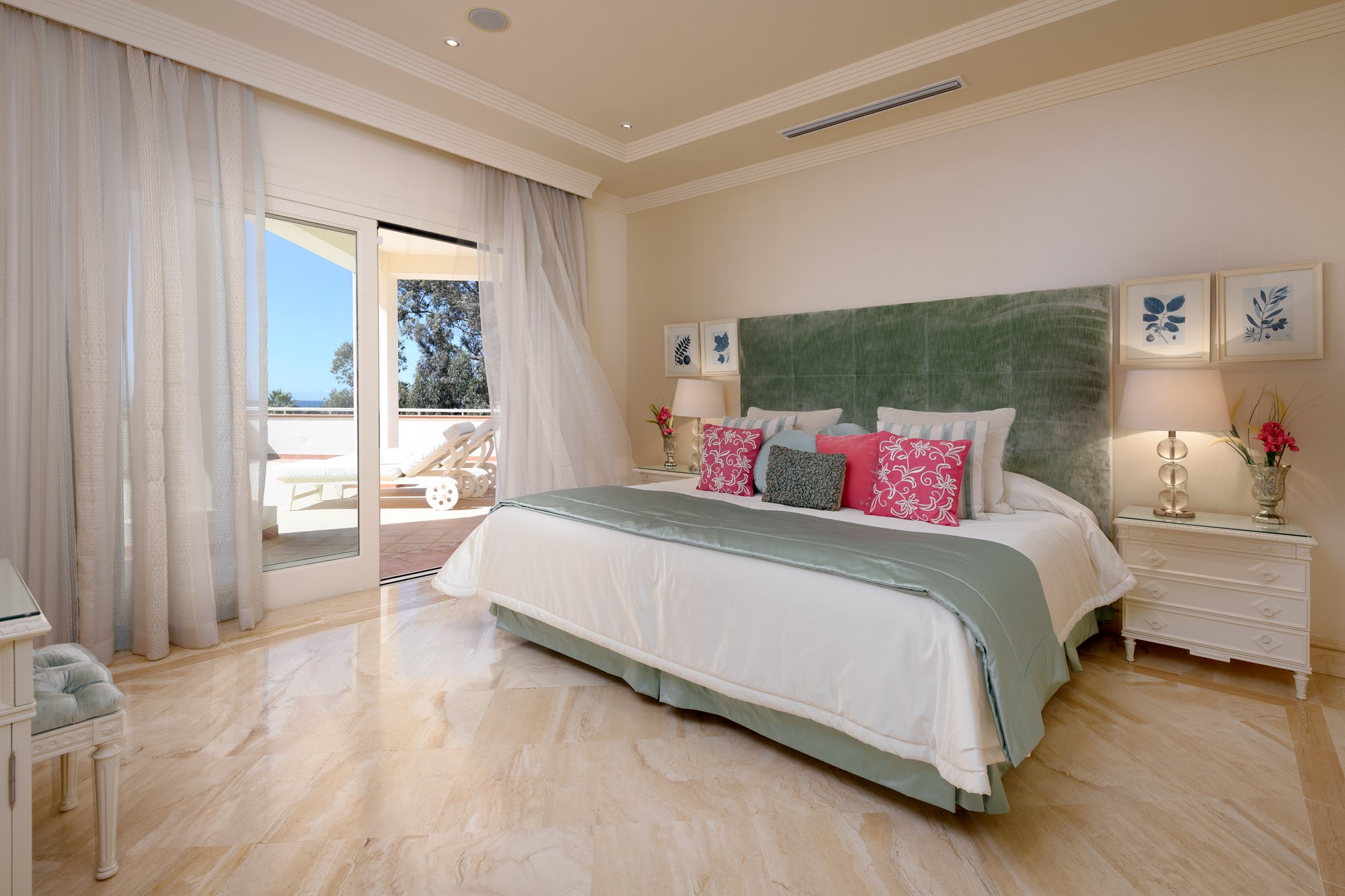 Principal Bedroom: Fit for royalty, the Marbella Suite is set on the top floor. It has two entrances and features an emperor-size bed (2x2m), high ceilings, full-length arch doors leading out to the top floor terrace with incredible sea and garden views, and a TV lift is hidden in the cabinet at the foot of the bed.