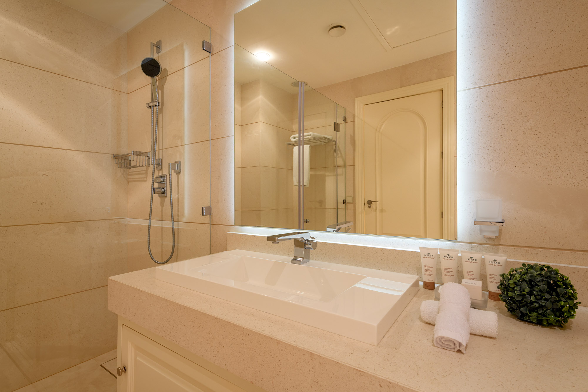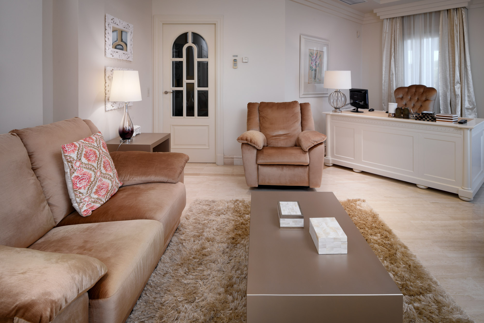 To the left side of the suite is a private sitting room and office area, which leads on to a bathroom with large walk-in shower, double washbasin, WC, and a VIP walk-in wardrobe/dressing area.