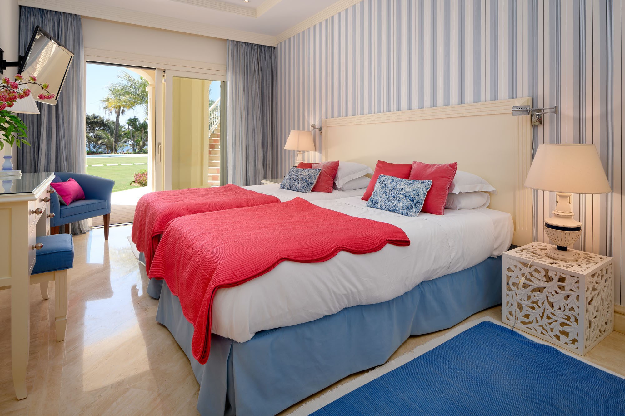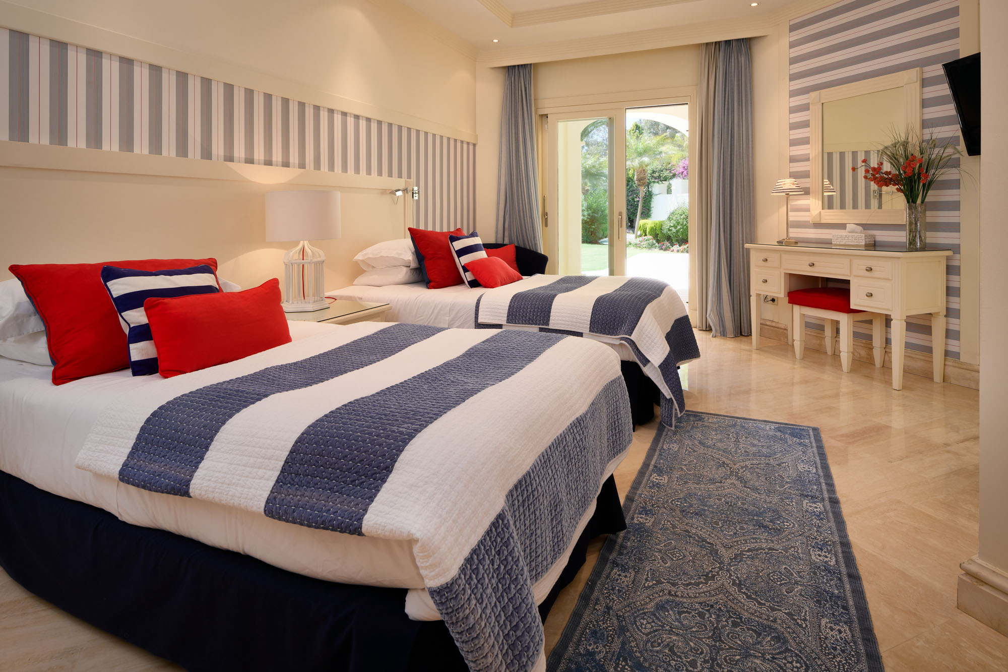 Granada Suite bedroom 3: Twin beds (105x2m each), wardrobes, TV, bedside tables, and doors leading out to a patio and gardens.