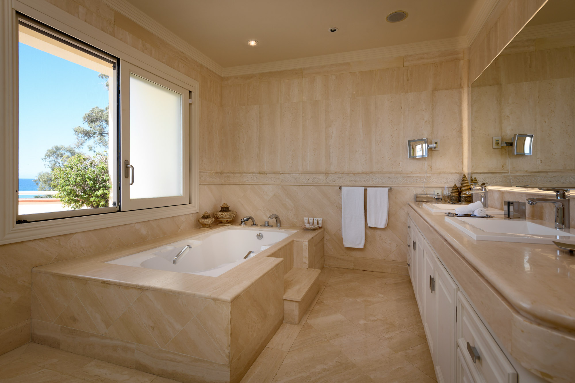 The palatial marble entrance opens into a glamorous reception hall with two sweeping staircases, leading the eye upwards to a brilliantly-lit glass dome roof. Rooms are just as impressive in size; each bedroom suite has its own sitting area and sea-facing terrace.