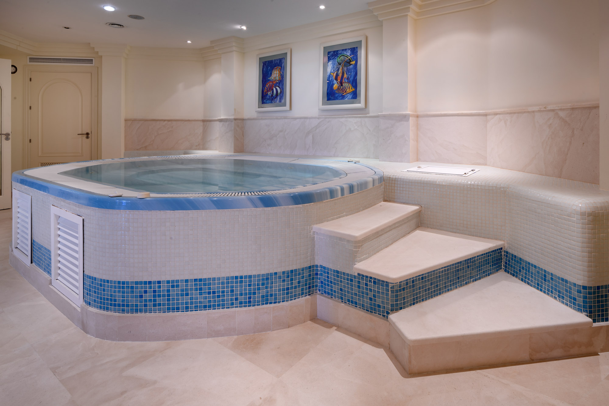 The lower floor has a complete private spa with a 7.85×7.85m hexagonal indoor heated pool, small Kettler gym, sauna and a large Jacuzzi hot tub.