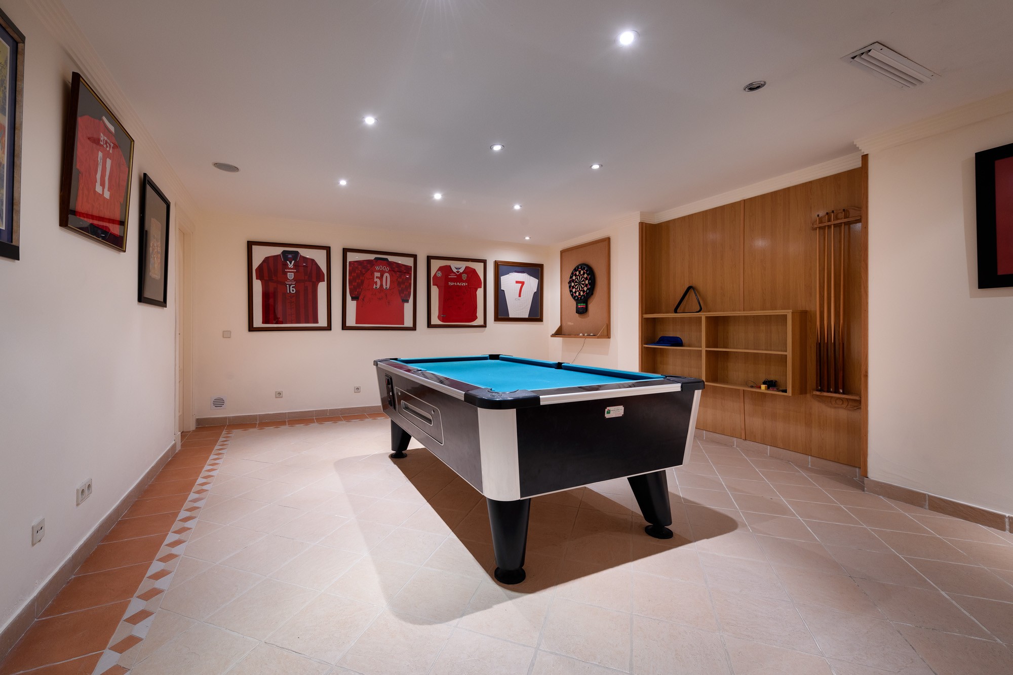 A separate pool room is decorated with signed sports memorabilia.