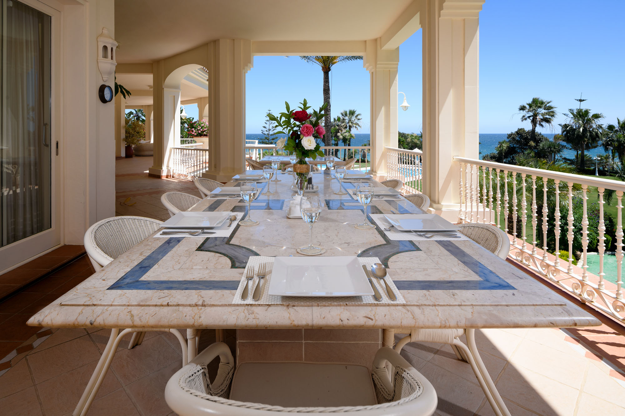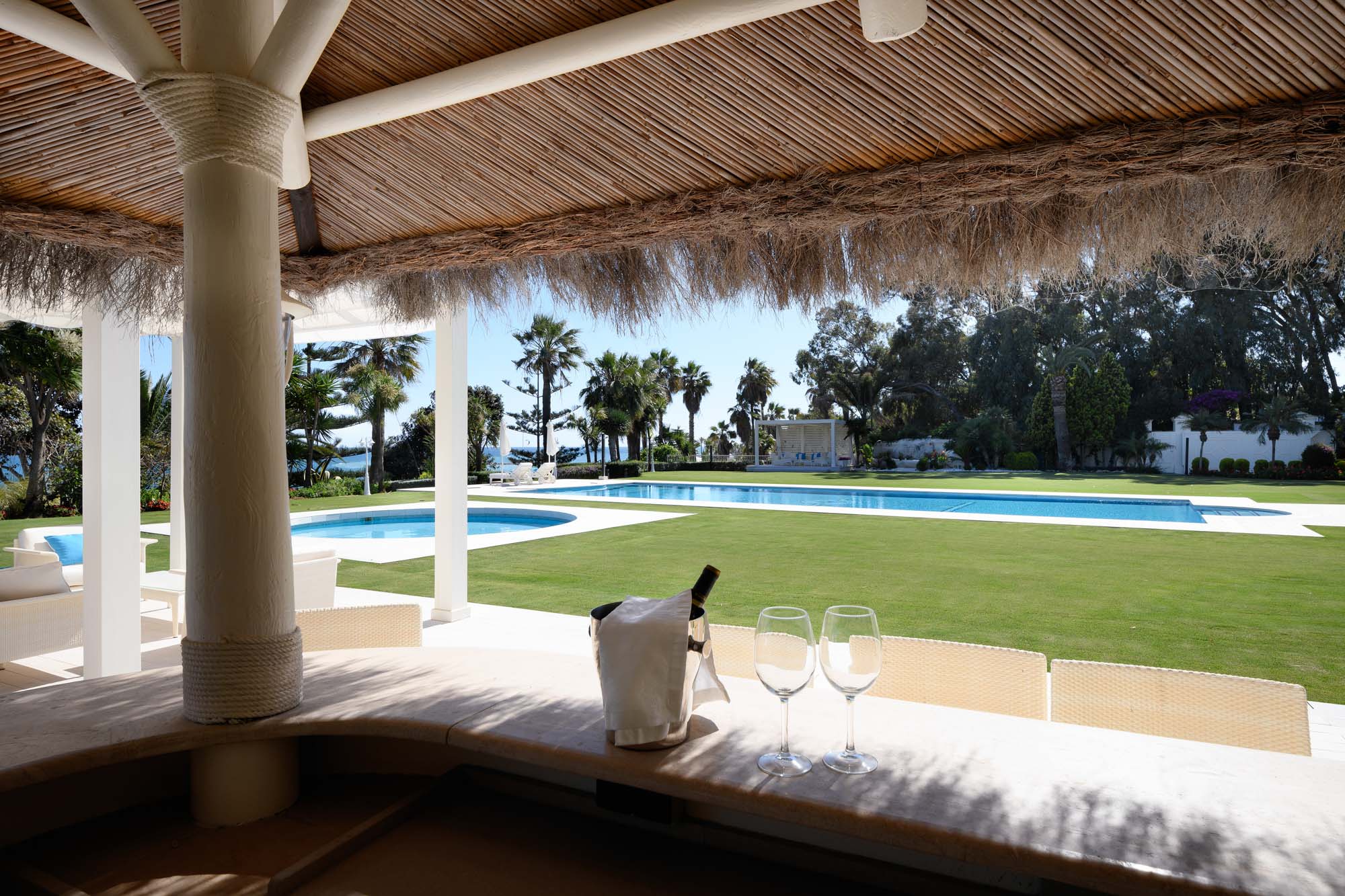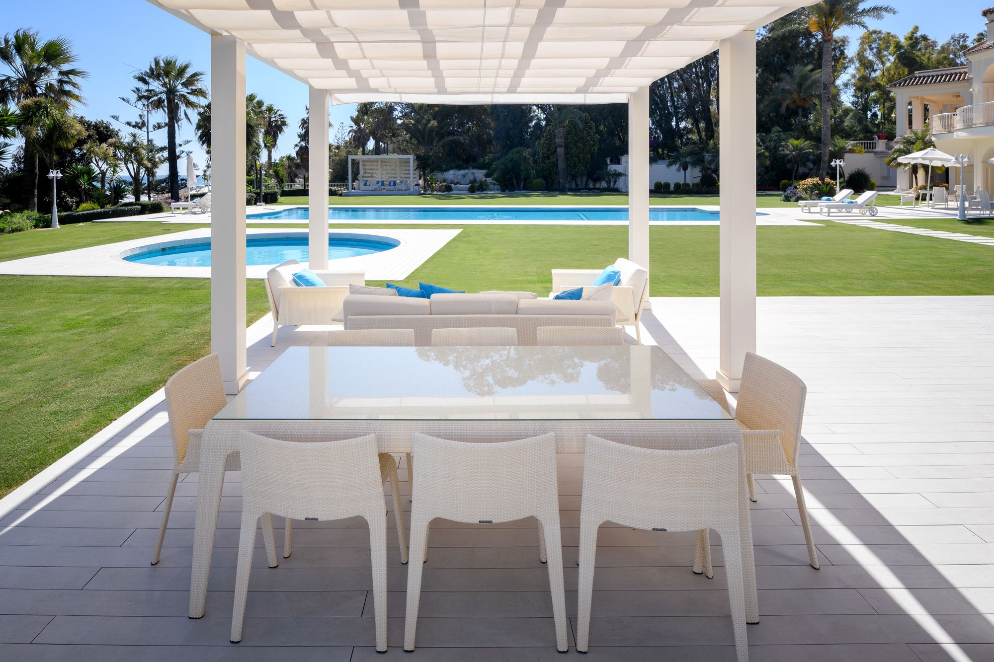 The terraces feature over-size living and dining furniture; sun beds can be found on the lower terrace and by the pool, and there are two covered terraces to each side of the manicured lawns both furnished for relaxing and dining.