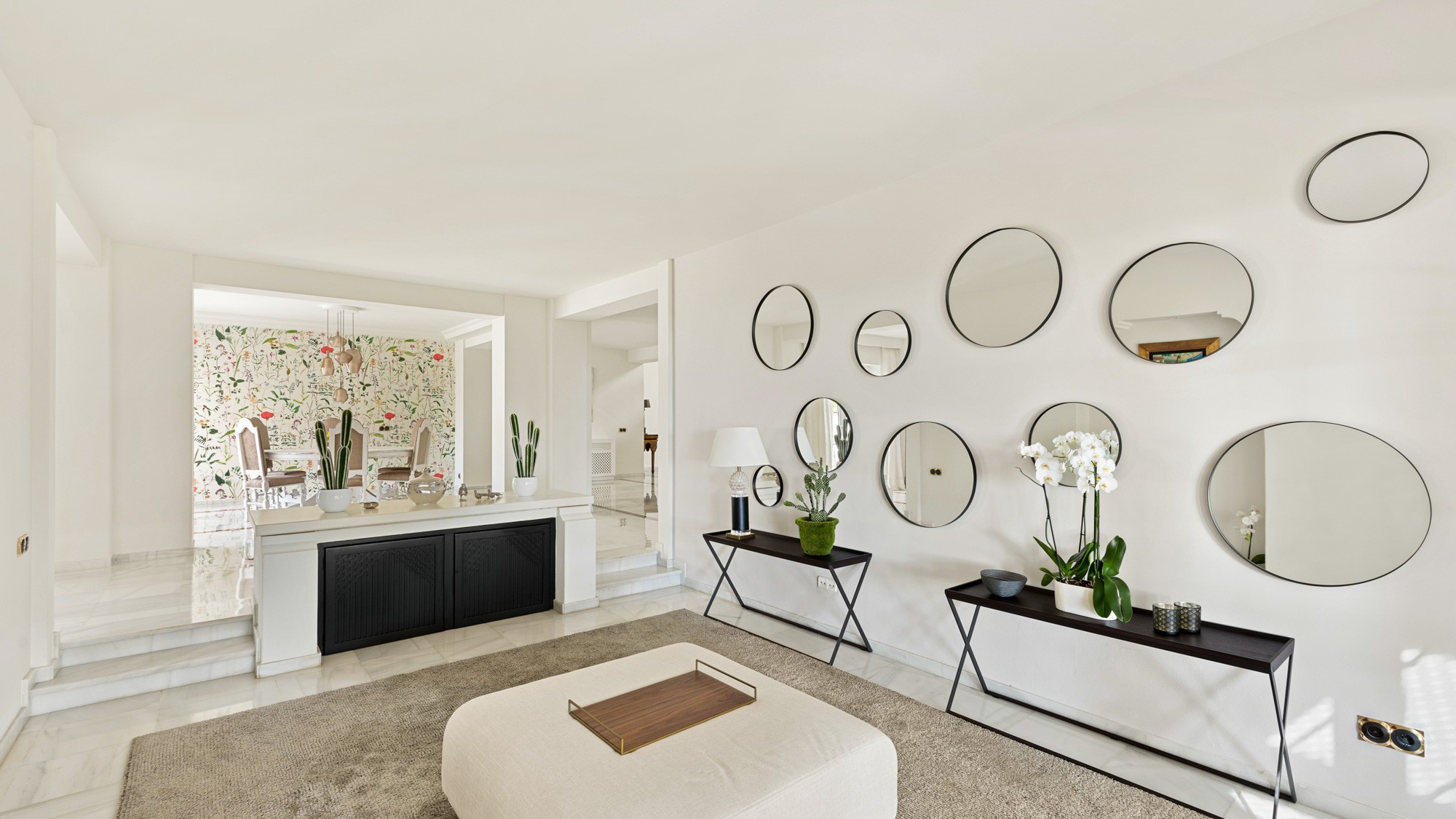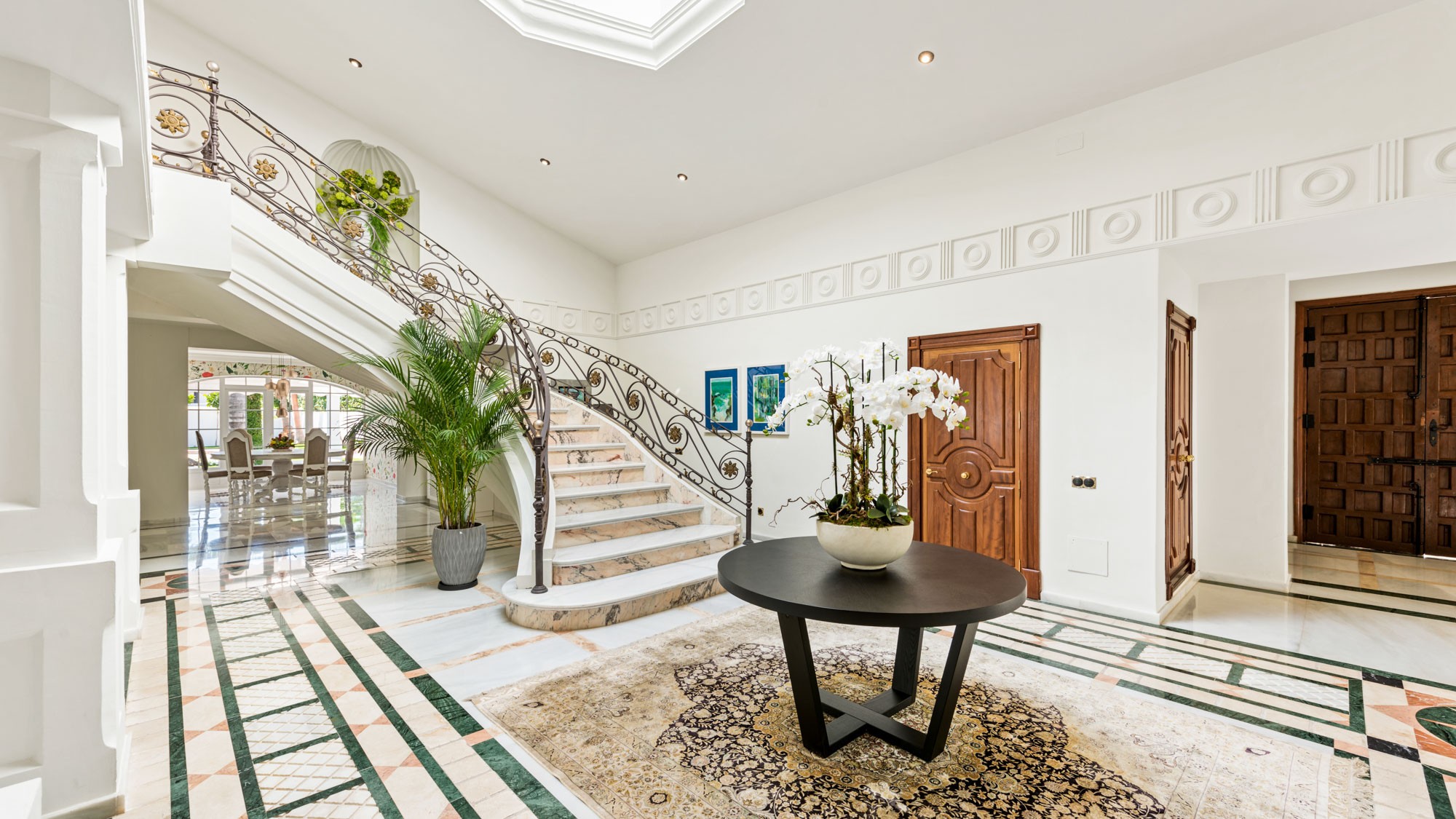 This lavish villa is accessed via a grand entrance hall with polished floors and regal white pillars, which feeds into an open-plan ground floor where each space flows freely into the next.