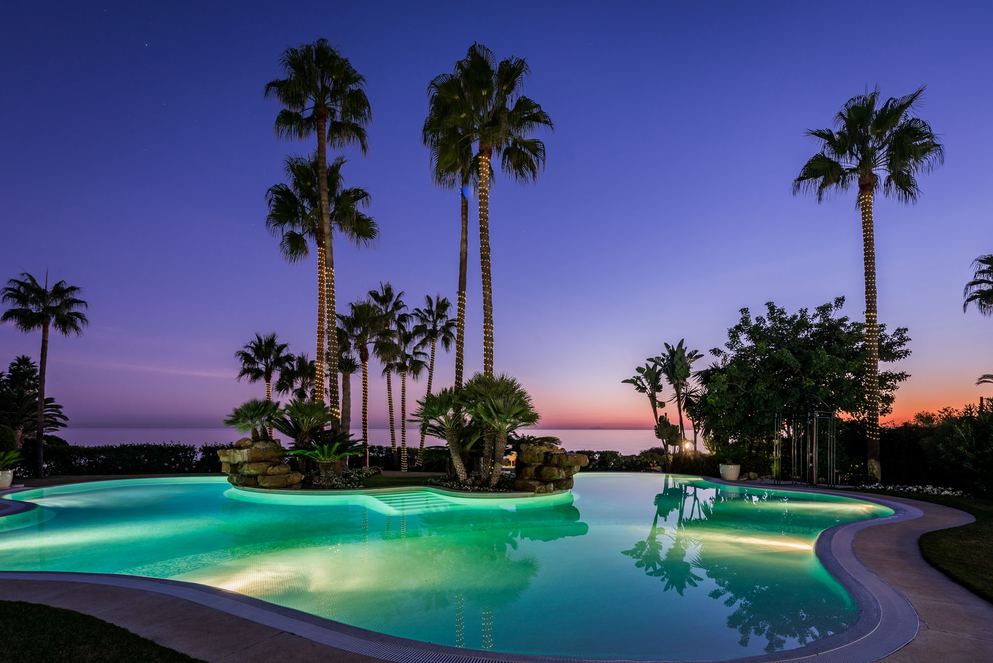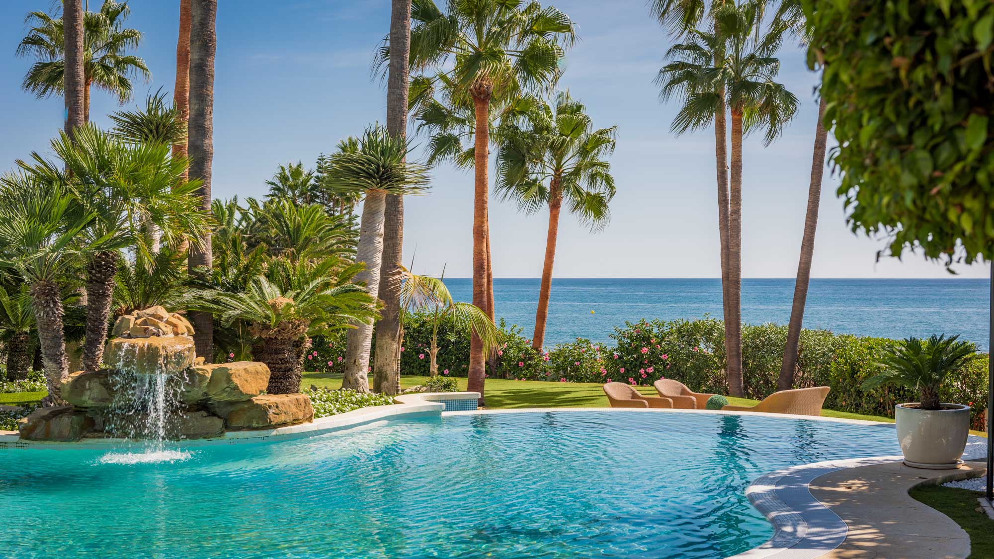 A tropical theme pervades the encircling gardens: towering palm trees, vivid green lawns, colourful flowers and a gorgeous lagoon-type pool with cascading waterfalls, its jewel-bright waters blending against a deep blue backdrop of Mediterranean sea and sky.