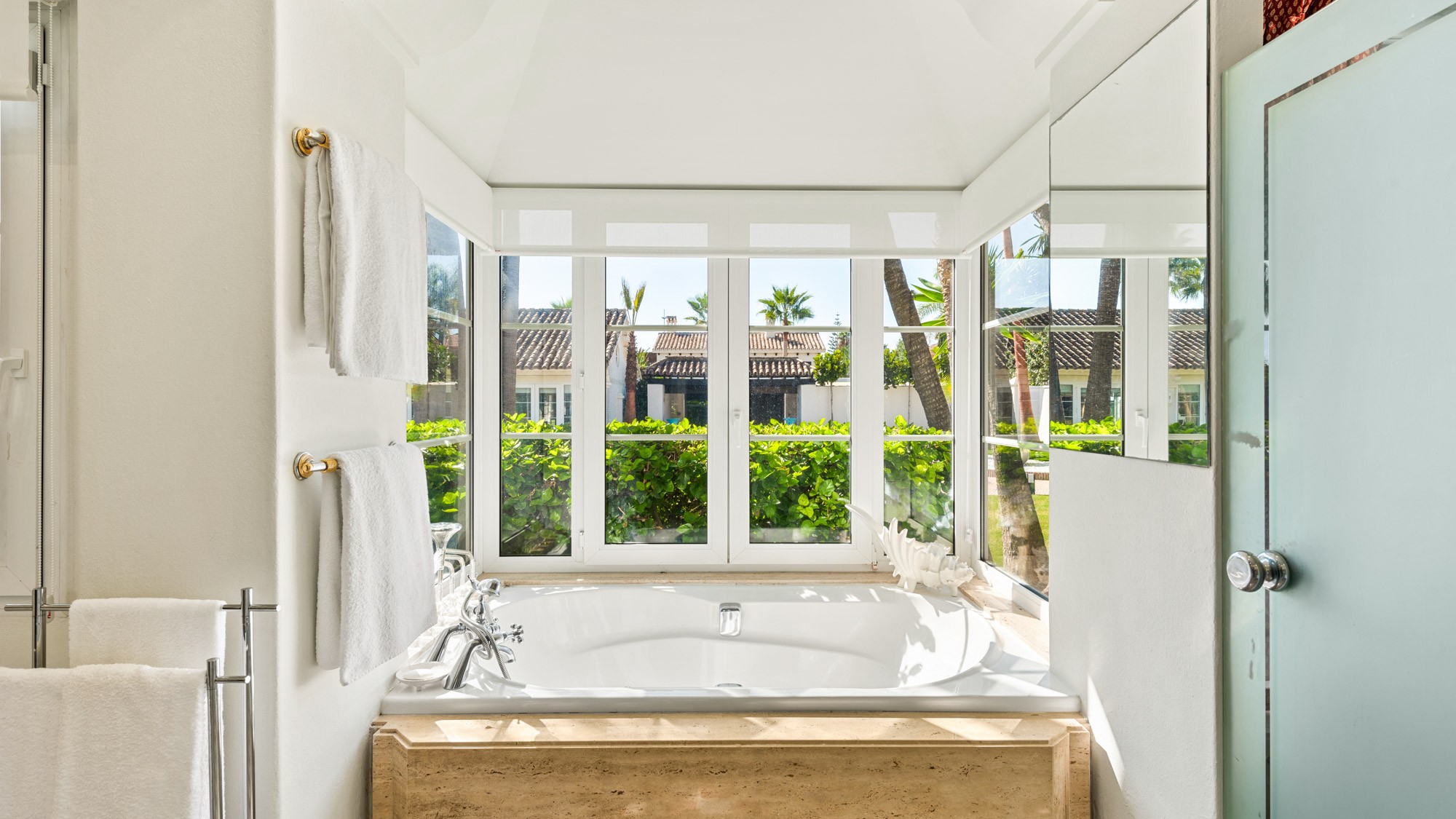 Its wall-to-wall windows offer up views of palm trees, gardens and sparkling sea – an idyllic sight to wake up to of a morning as you prepare for another day in paradise.