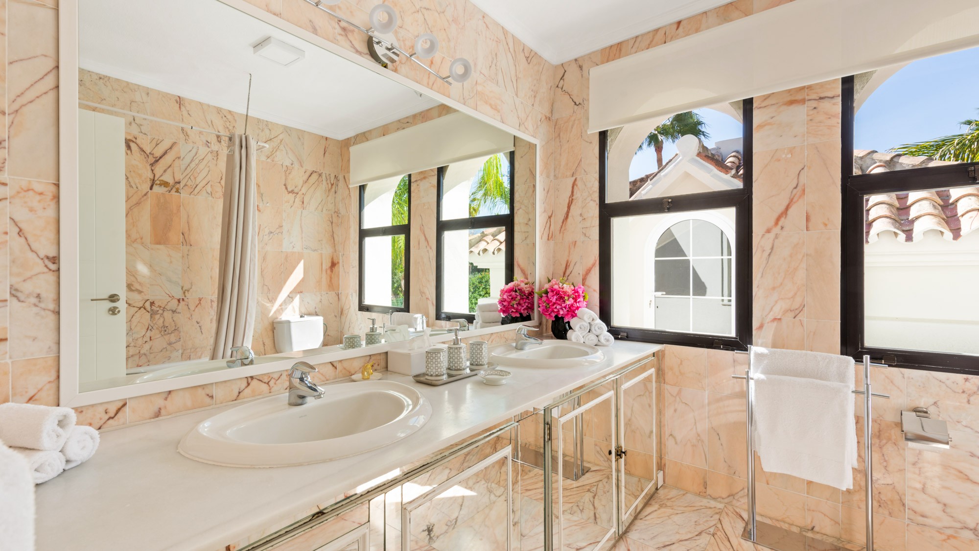 Two living rooms and a separate TV sitting room on the spacious ground floor mean you have your pick of quiet corners to relax in, and the huge outdoor terrace is ranged with comfy sofas and deep armchairs ideal for an afternoon siesta.