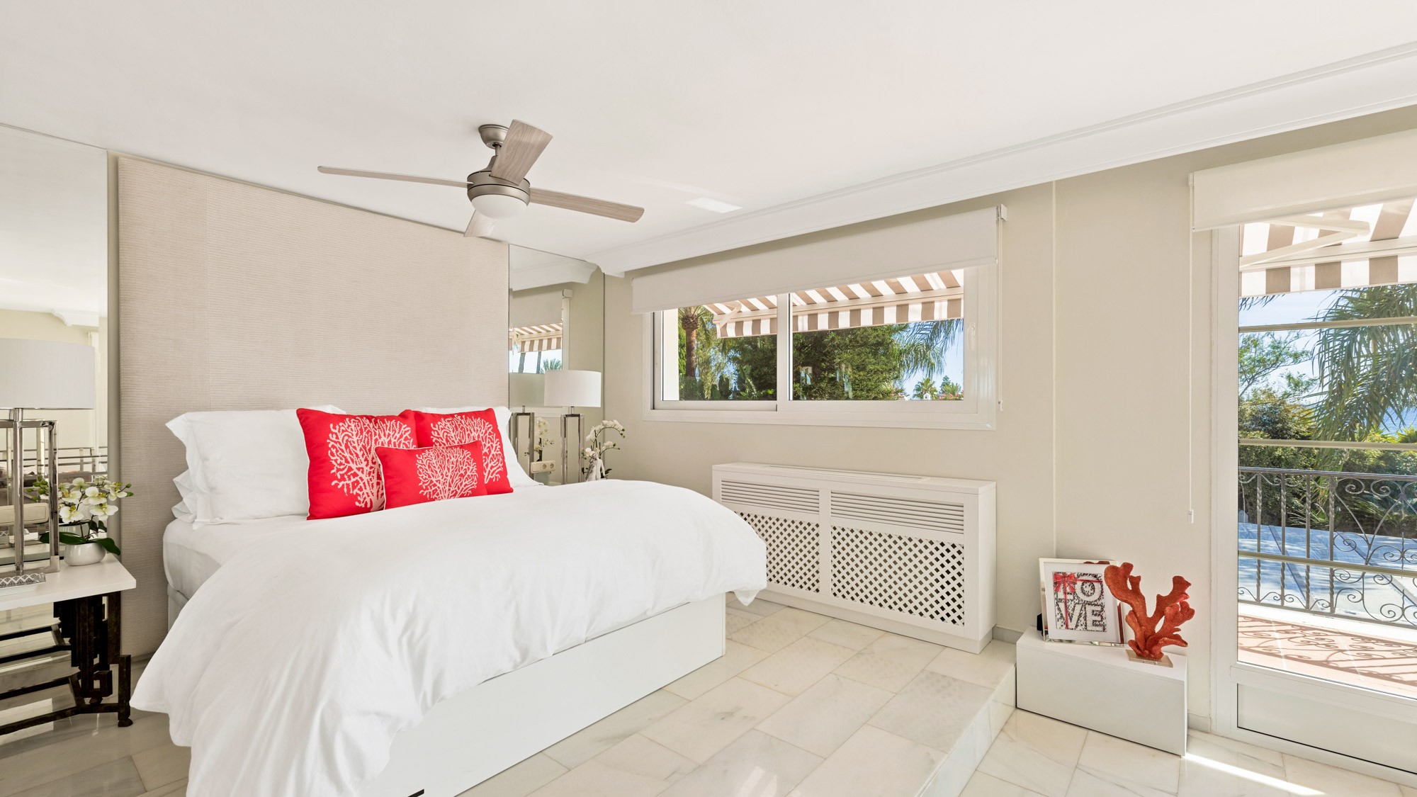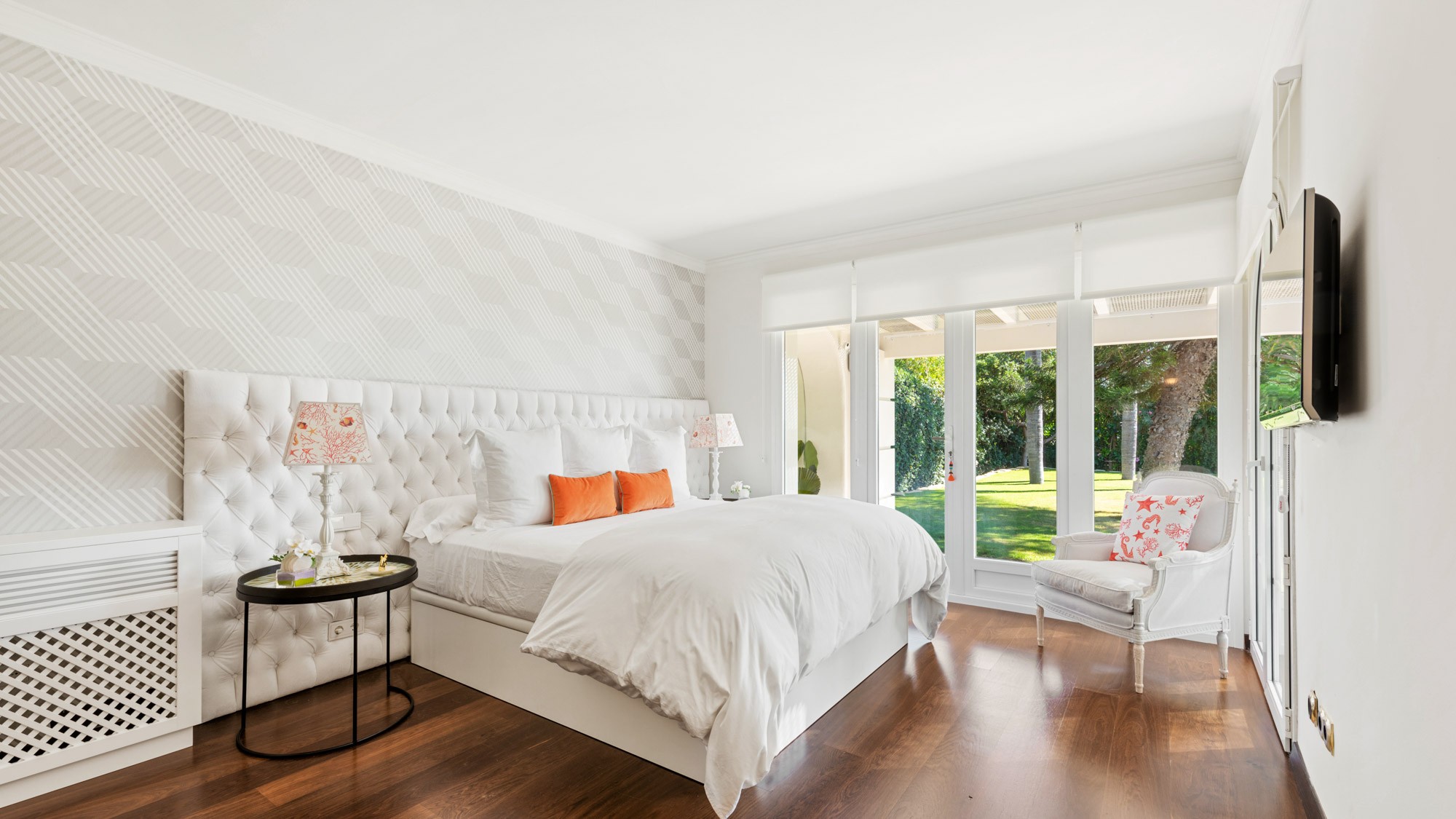 Bedroom 2: Main bedroom in the family suite – located on first-floor corridor, to right of the stairs. Features white and coral-pink colour scheme, super-king sized bed (180cm x 200cm), TV and windowed doors leading onto a private sun terrace with views of pool and garden.