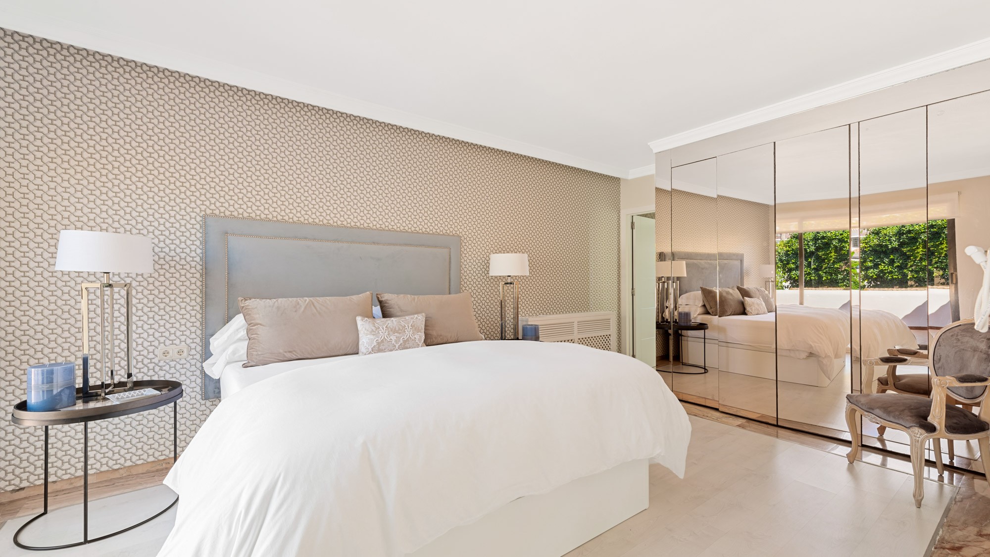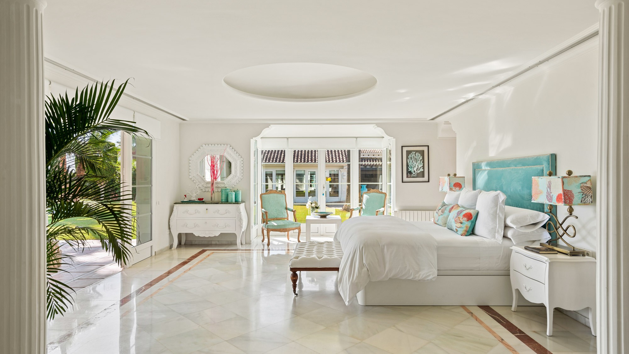 Bedroom 1: Principal Suite located on ground floor of main property. Accessed via a traditional, wood-panelled dressing room, this spacious room has a neutral white colour palette with beachy touches. Features king-sized bed (150 x 200cm), vanity table, two throne-like armchairs, writing desk, widescreen TV and marble floors. French windows open onto the terrace and garden.