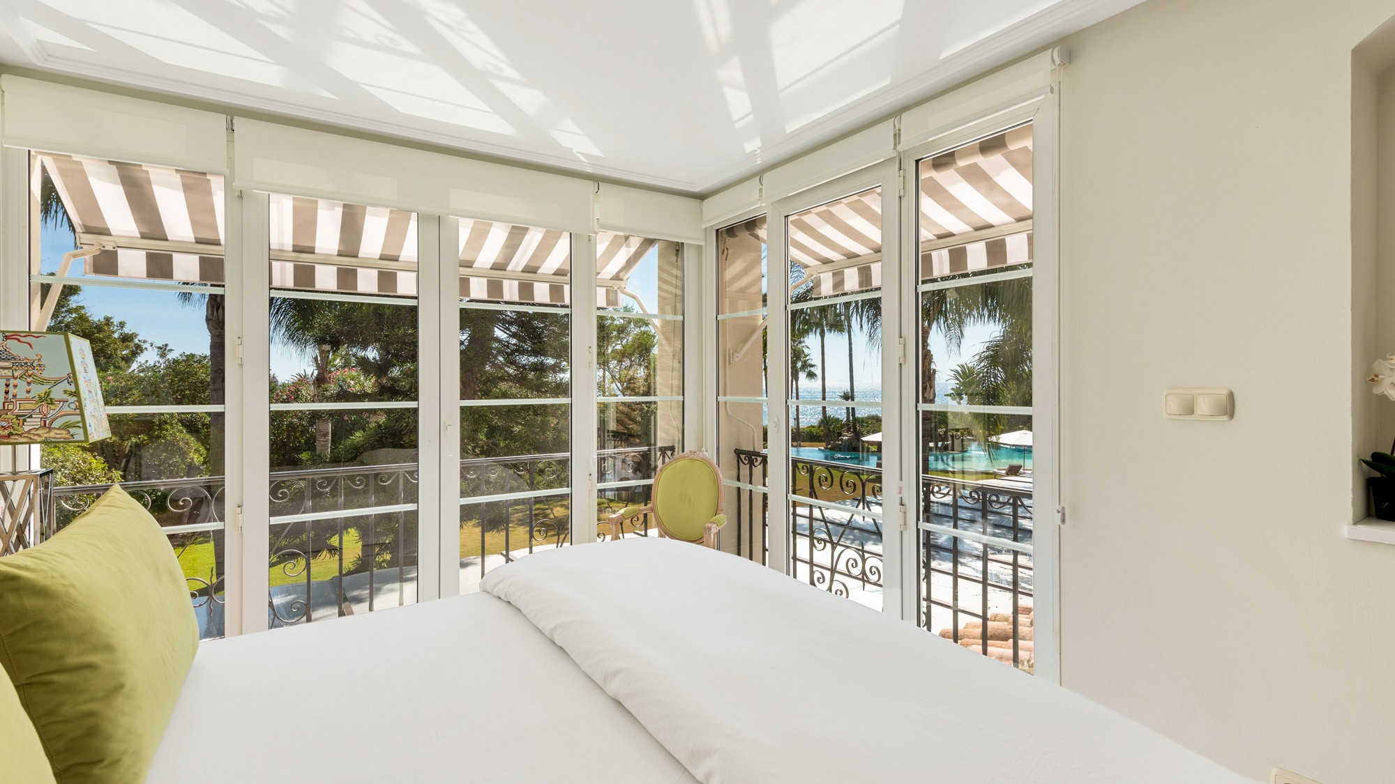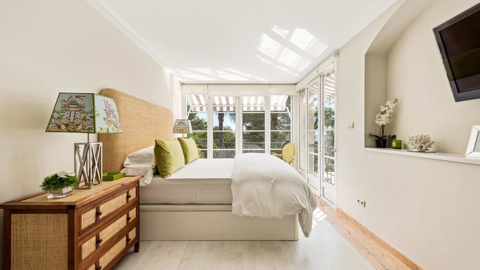 Bedroom 5: Located on first floor, next to bedroom four. This room has a neutral colour scheme with olive green accents and features a super-king sized bed (180 x 200cm), wall-mounted widescreen TV and windowed doors on two sides, which flood the room with light and display views of pool, garden and sea.