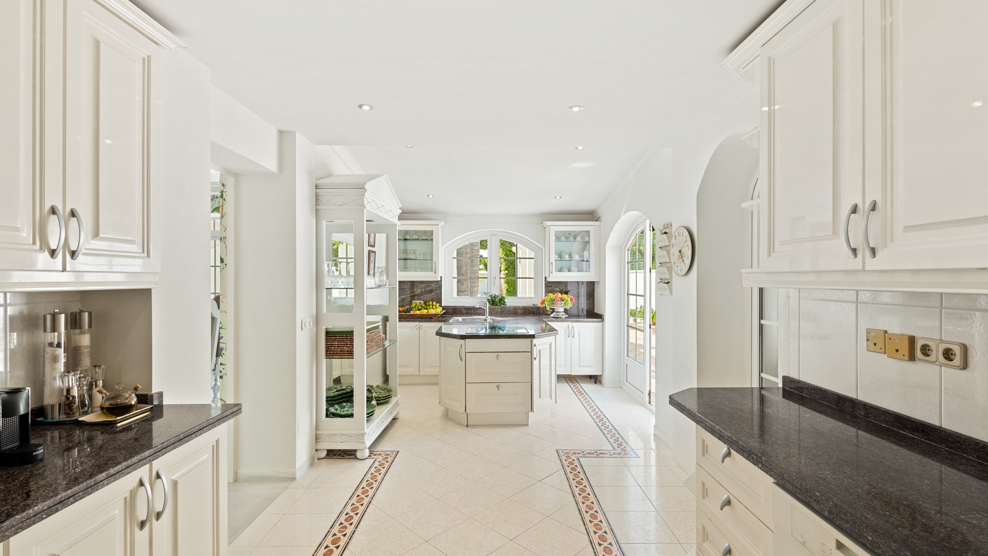 Cooking at Villa Oceane is any chef’s dream, with two kitchens to choose from including a well-stocked family kitchen with cream cupboards, traditional tiling and a central island with an electric hotplate and sink.