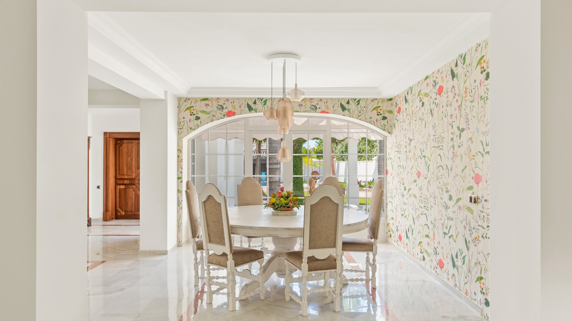 Also on the ground floor is a family-sized dining table, situated in a charming wall-papered enclave overlooking a sun-dappled courtyard beyond.