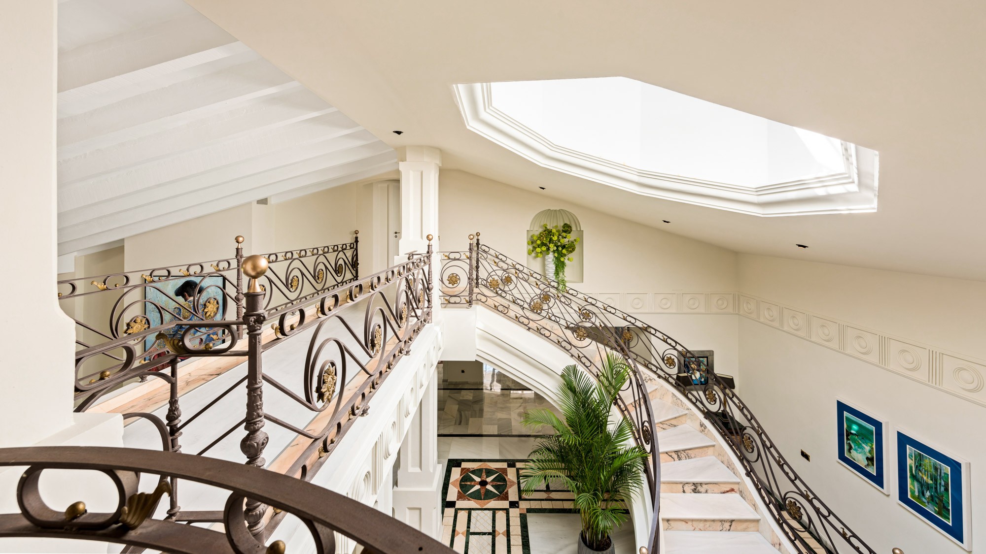 A sweeping marble staircase bisecting the entrance hall leads up to the first floor, comprised of adjacent wings containing two bedrooms each, connected by a walkway overlooking the lounge.