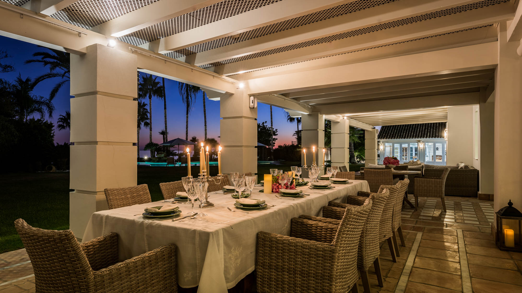 The first floor of the property feeds onto an expansive covered terrace split into three zones. Deep sofas and wicker armchairs provide ample space for relaxing, and the large exterior table is the perfect spot to lay out breakfast or enjoy a candle-lit dinner party after dark.