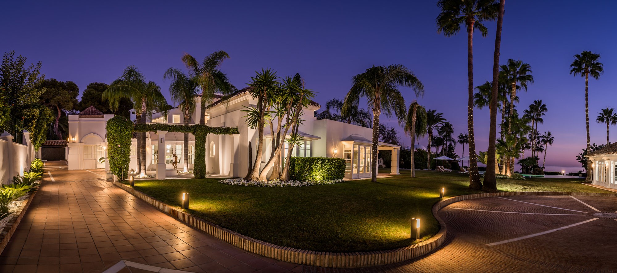 Villa Oceane is revealed as double gates open onto a sweeping arc of red-bricked driveway: a handsome, low-slung property with a distinctly palatial air, its immaculate white facade gleaming in the sunlight.
