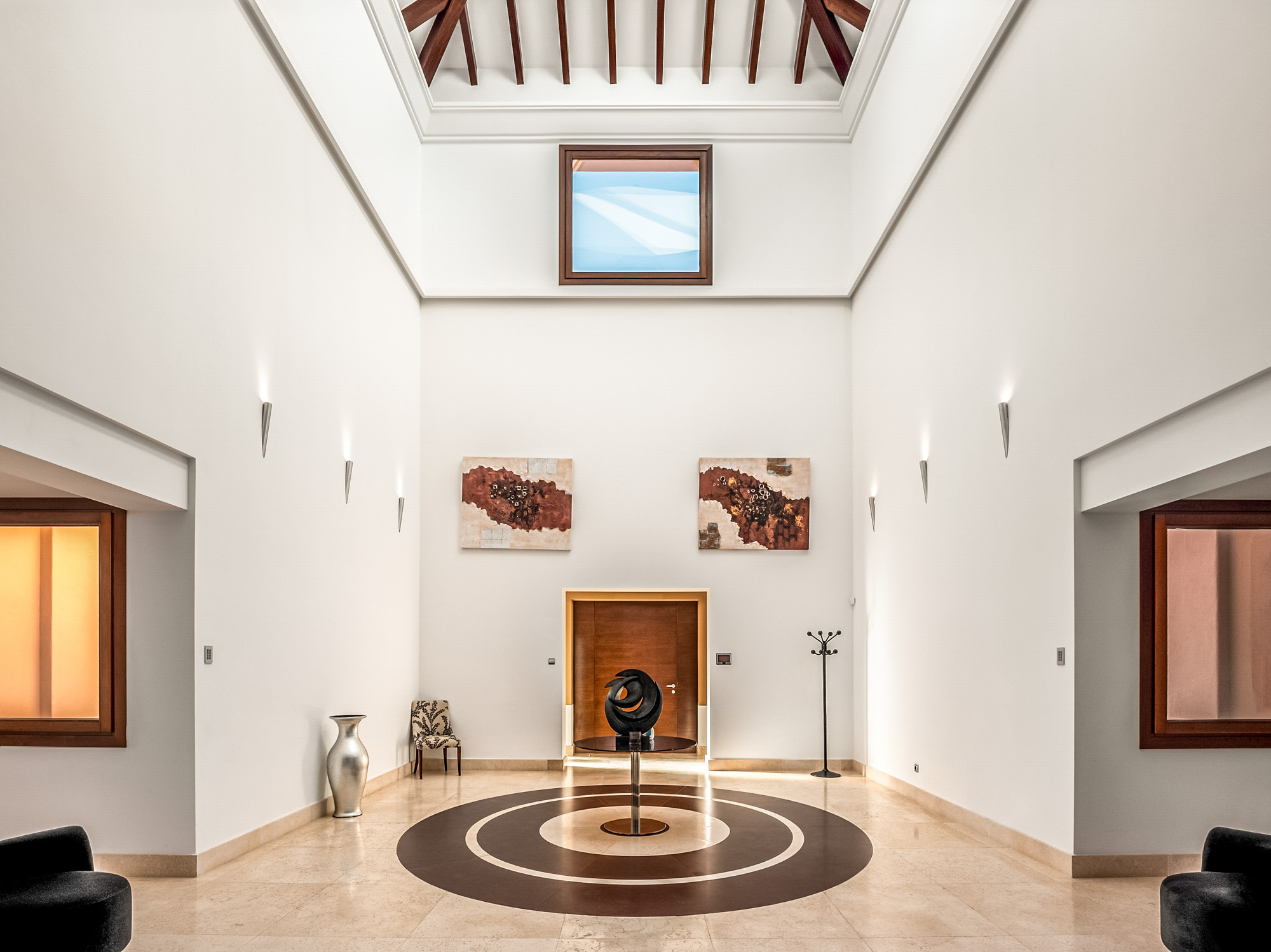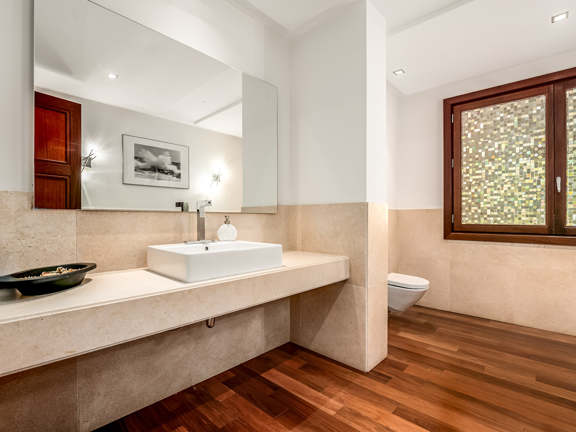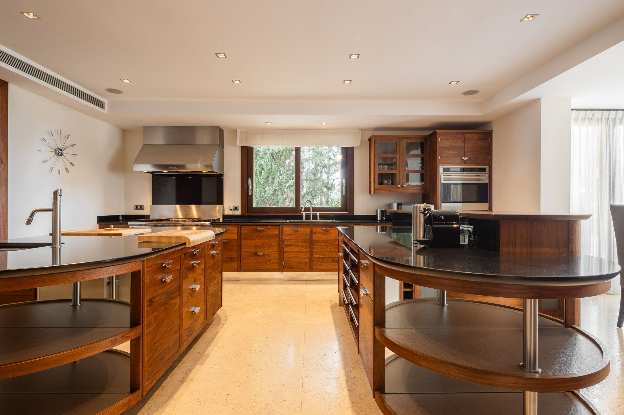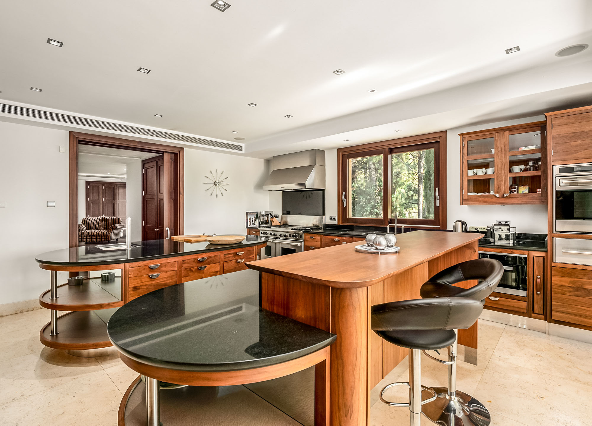 There is a second living room downstairs in the bar, and an outdoor lounge outside in the poolside chiringuito at the bottom of the garden, making this an ideal villa for both summer living and cosy winter breaks. An elevator serves all floors.