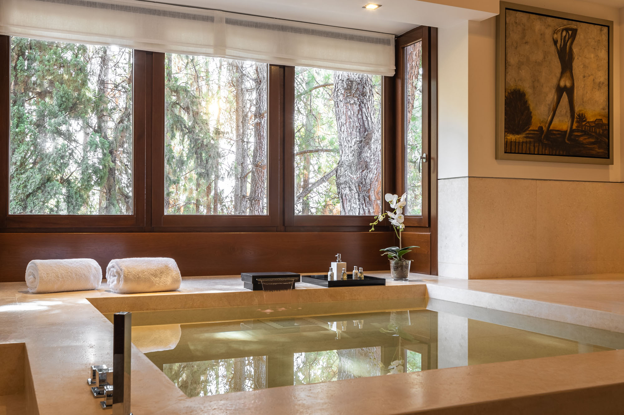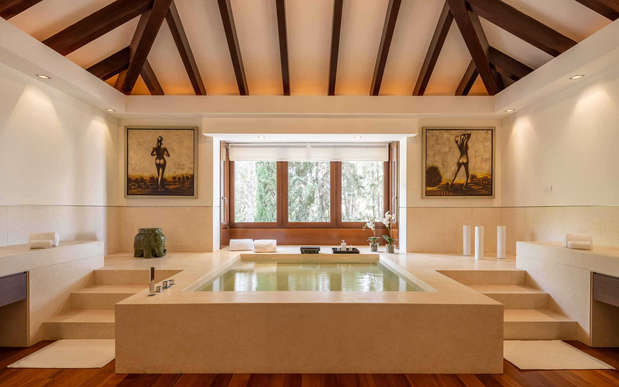 The private SPA is located in the lower ground floor of the villa and contains the heated pool, a treatment room, sauna, Turkish bath and a cold plunge pool. There is also a fully equipped gym and showers adjacent to the SPA.