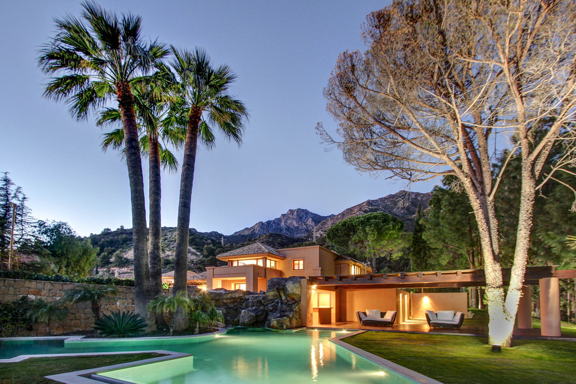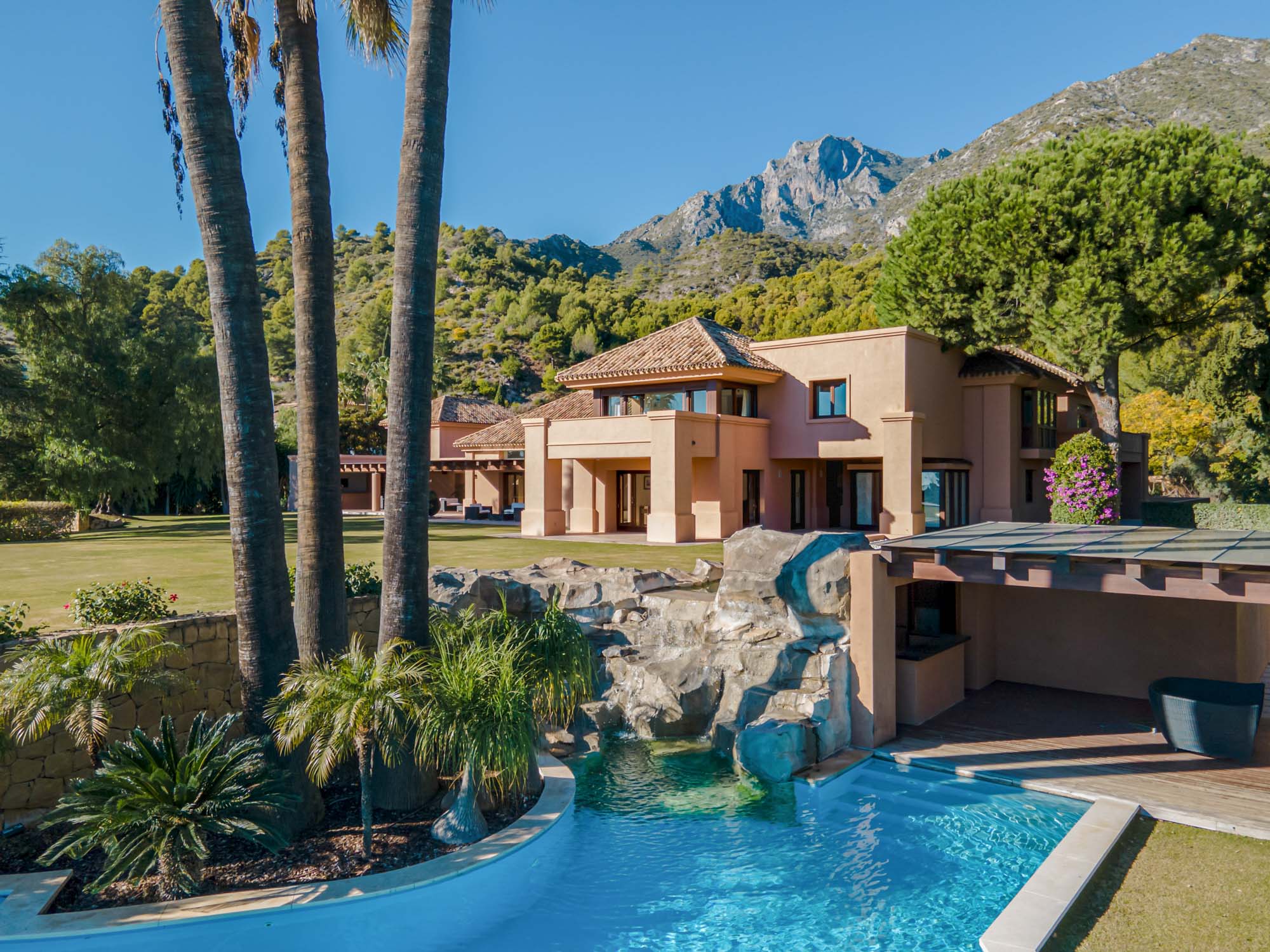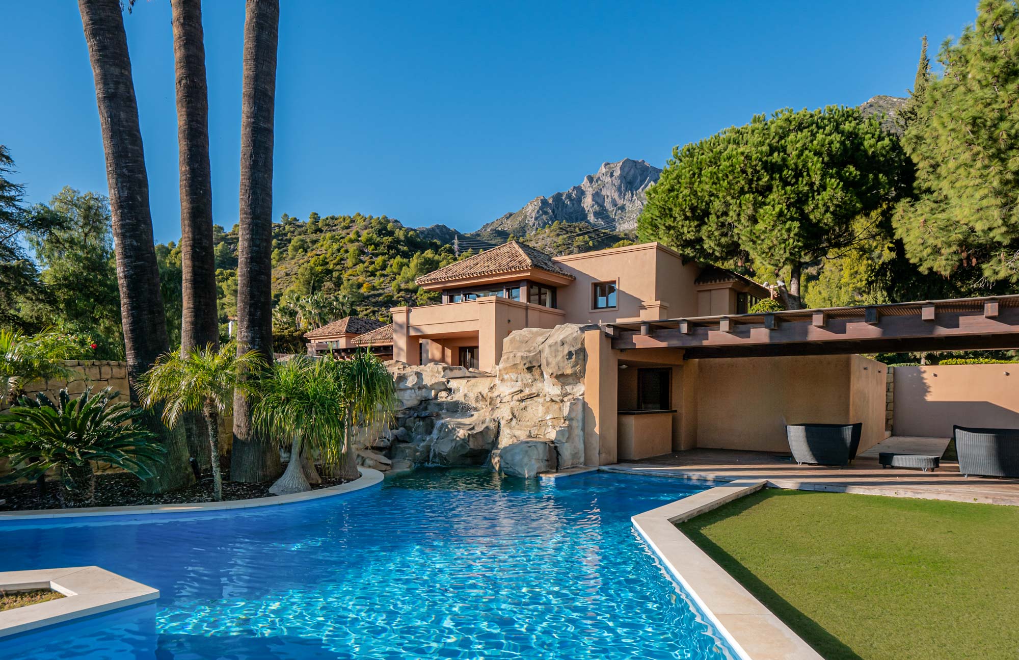 The private infinity pool sits on the upper level of over 8,000m2 of landscaped gardens, then one level below this you will find the lagoon-style pool and a waterfall cascade, with a hidden summer lounge, the “Chiringuito”, with a bar.