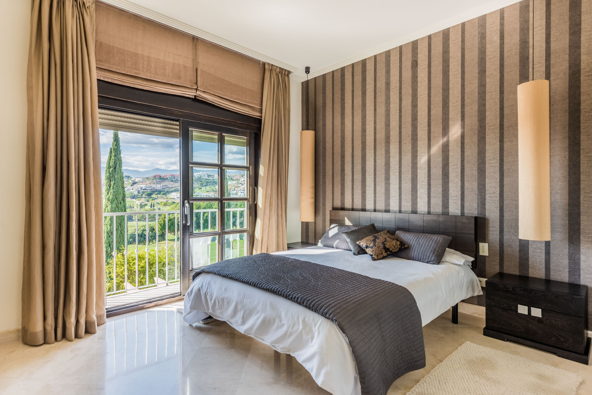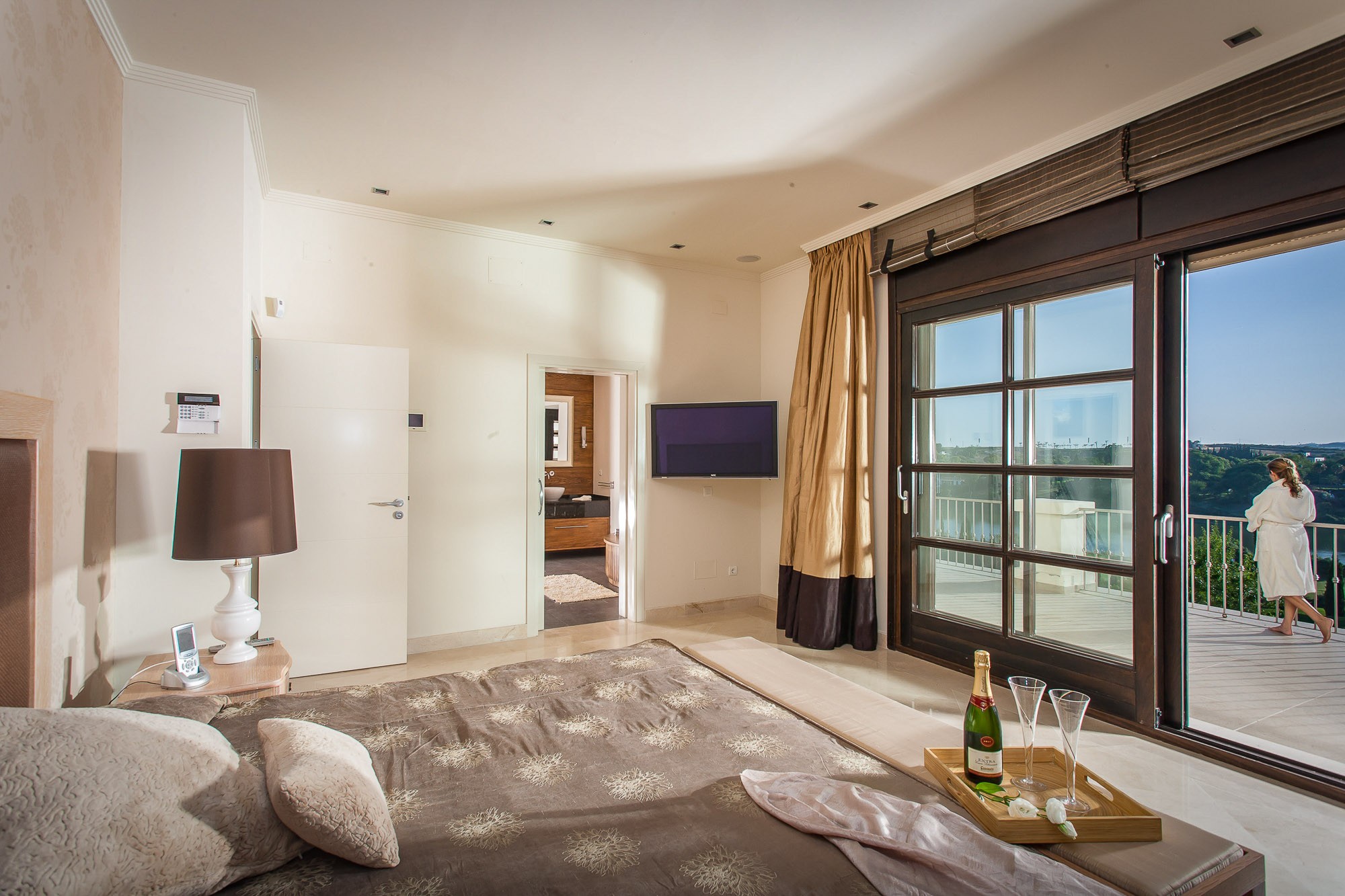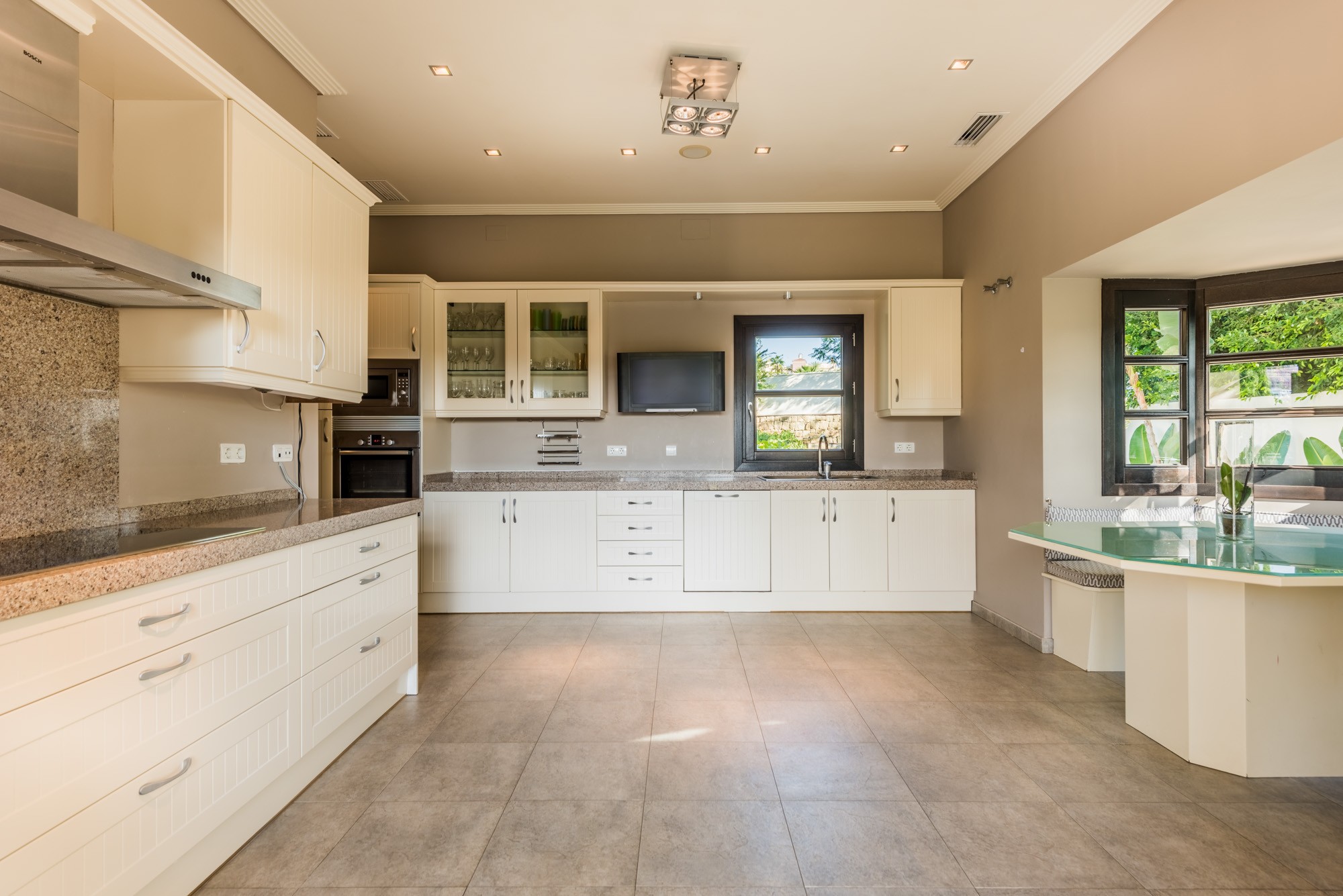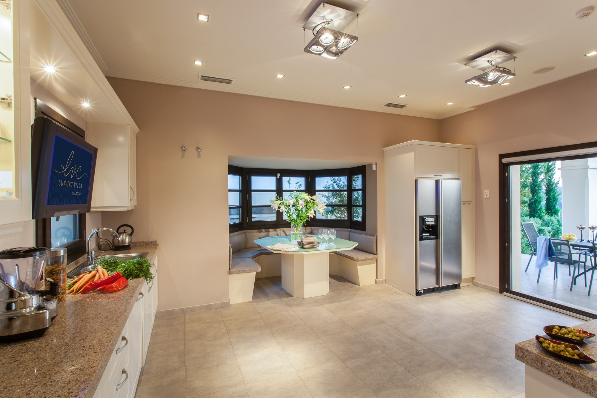 Designed for entertaining, the kitchen has a side-by-side fridge-freezer, with chilled water dispenser and ice-maker, plus a cosy breakfast booth in a window alcove. From here you can access the terrace to take breakfast in the warm sunshine.