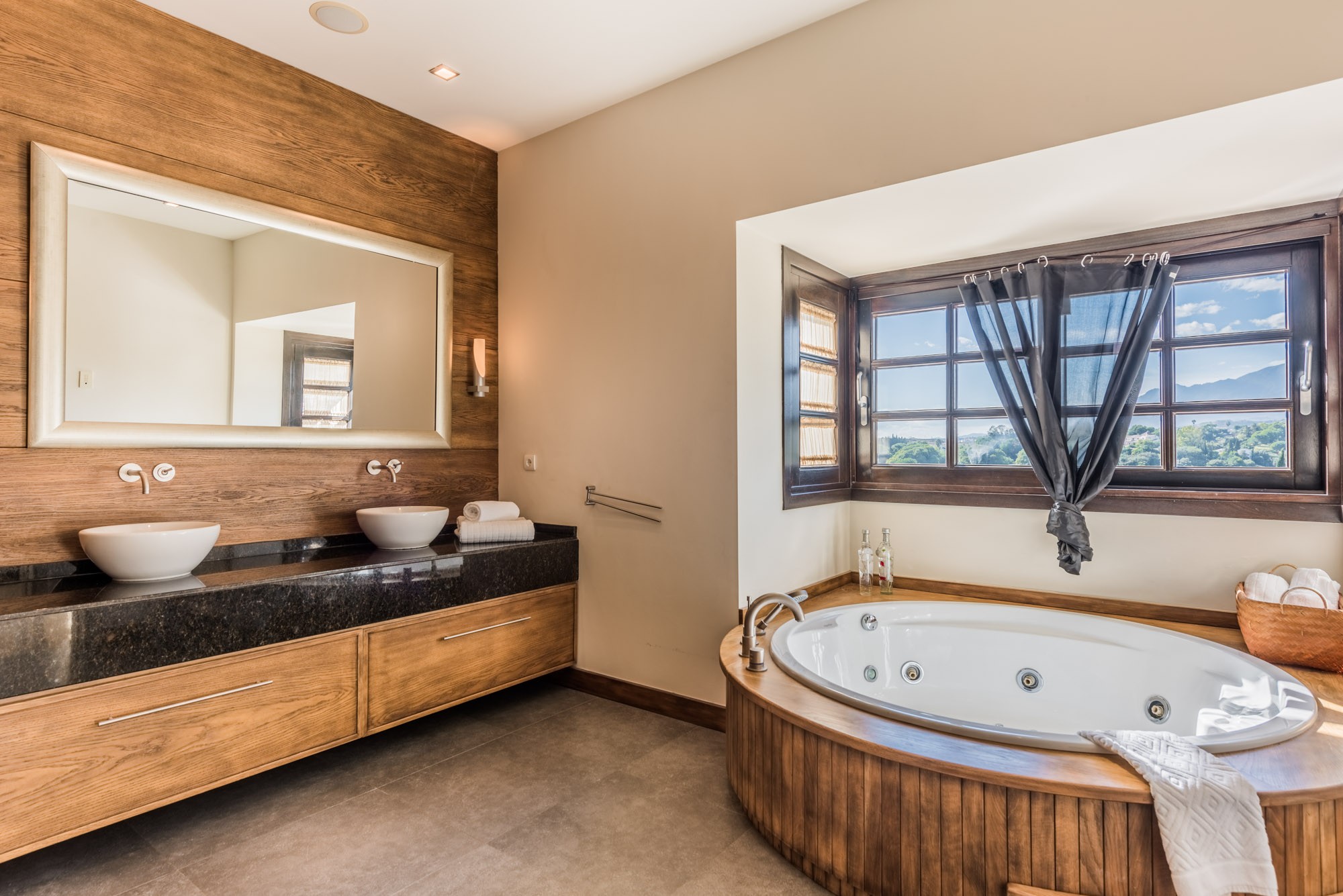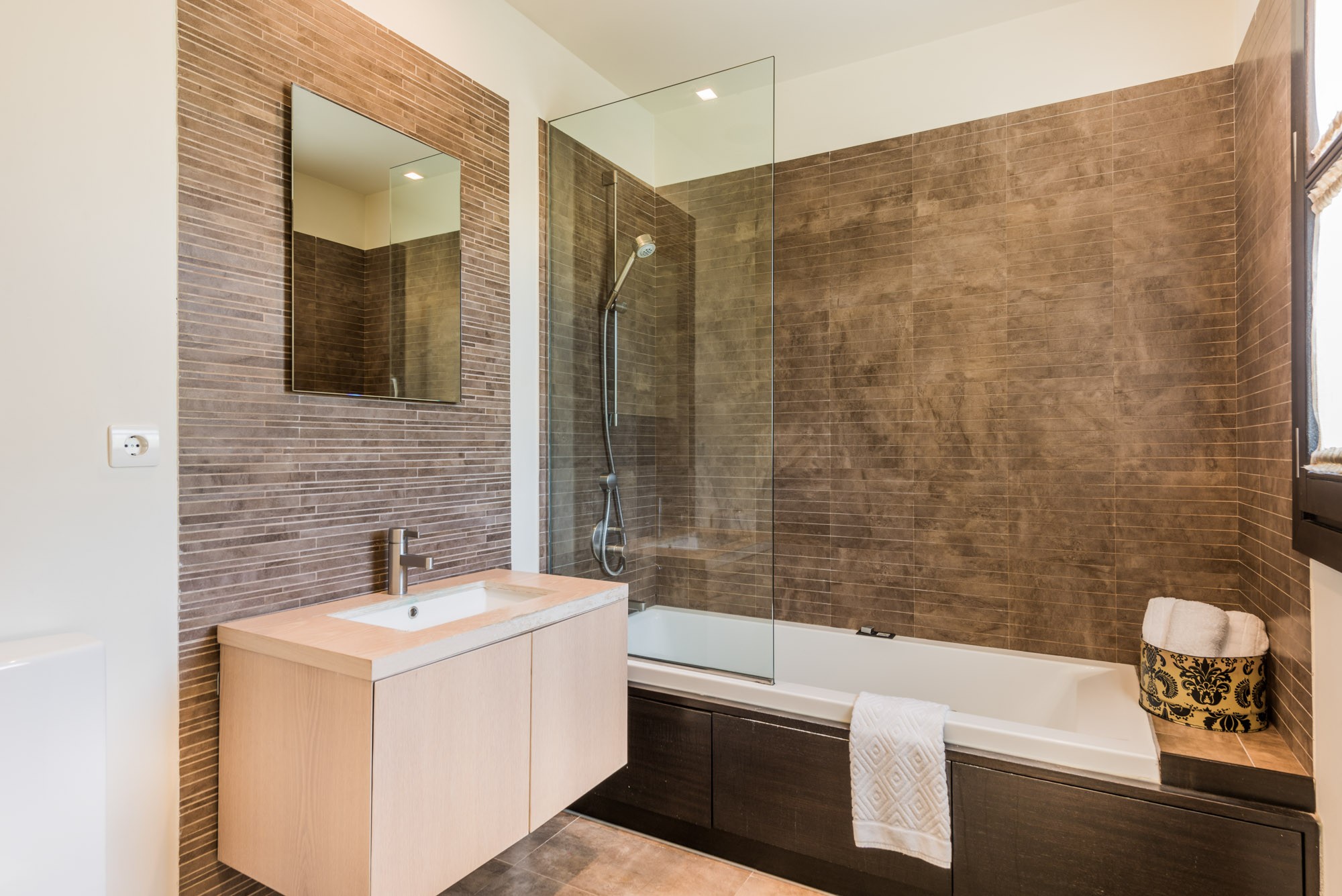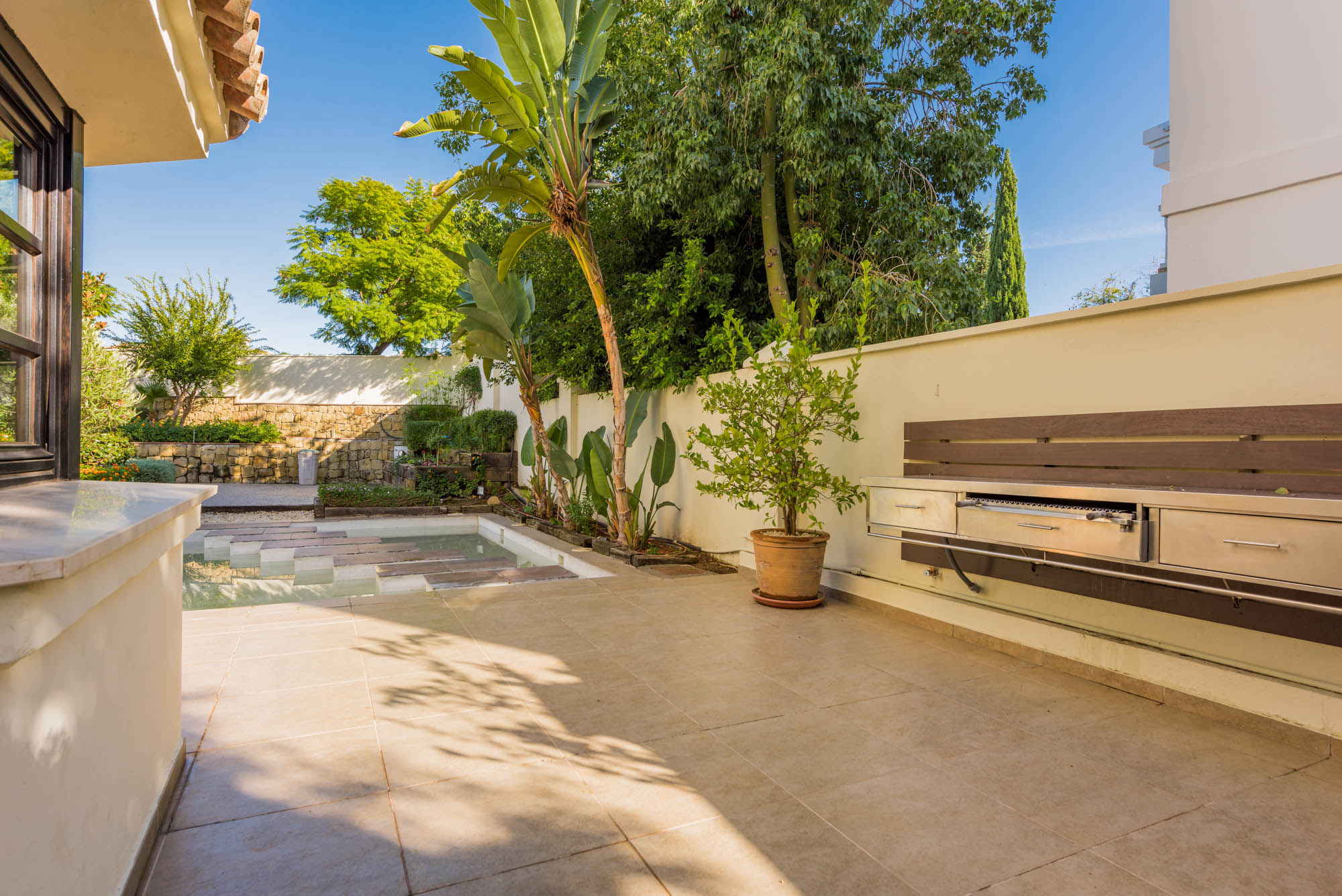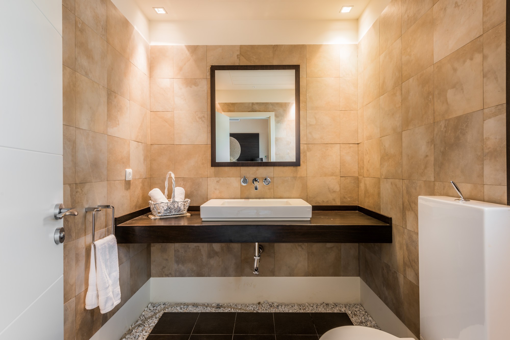 Designed for entertaining, the kitchen has a side-by-side fridge-freezer, with chilled water dispenser and ice-maker, plus a cosy breakfast booth in a window alcove. From here you can access the terrace to take breakfast in the warm sunshine.