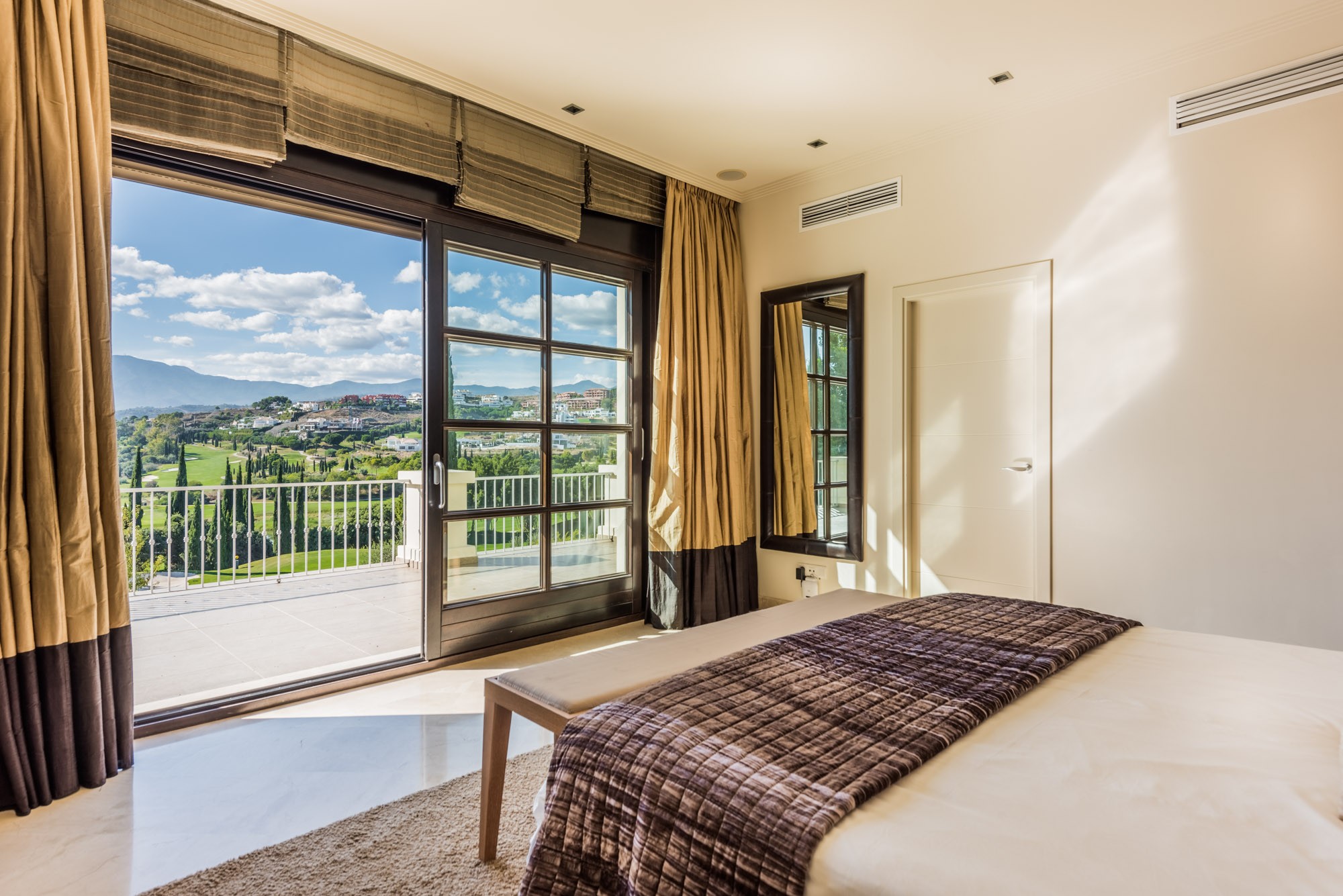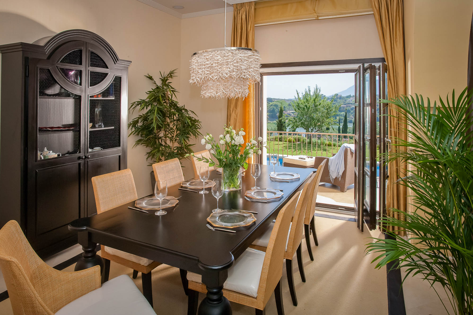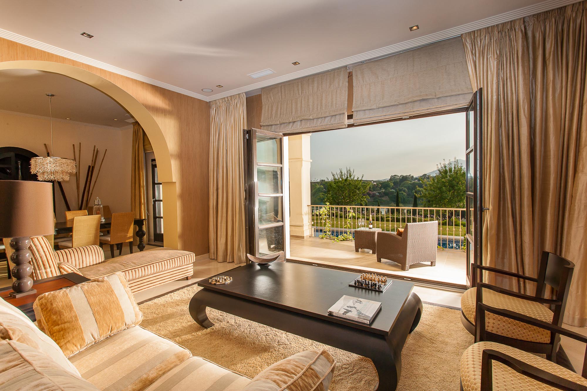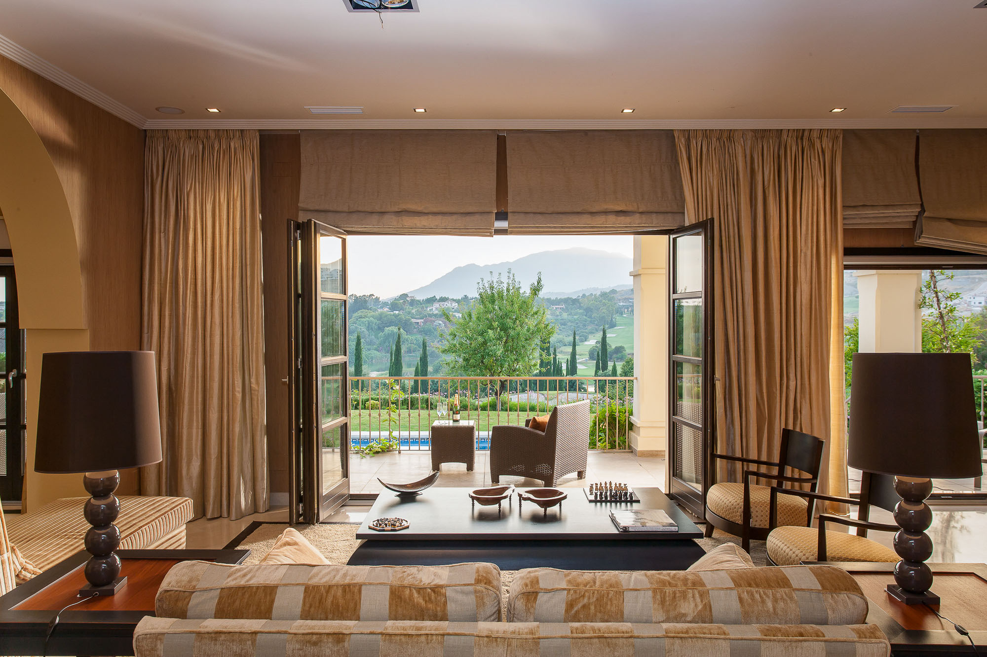It’s all very light thanks to wall to wall French windows that lead to the terrace; all three rooms can be opened up completely, offering an uninhibited view of the garden, golf course below, and countryside beyond.