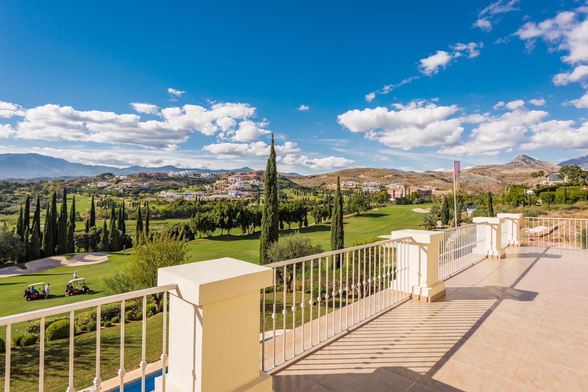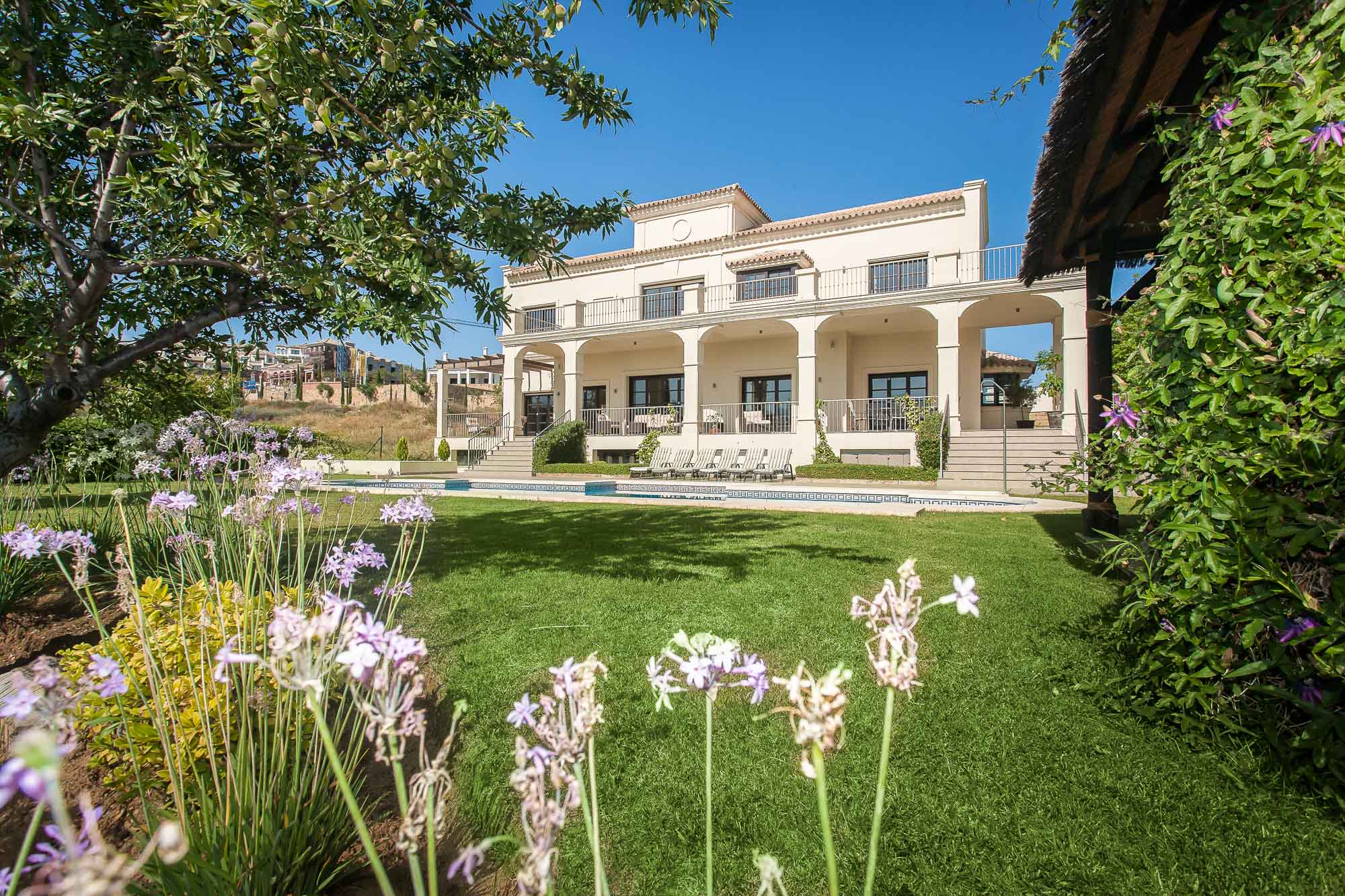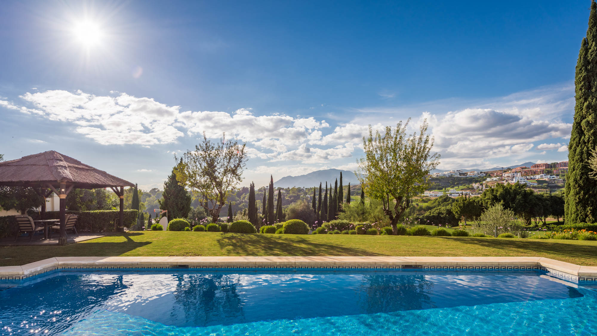 The generous dining and sitting room has two separate living areas: the TV area with a sizable corner sofa; and the central living room has plush Italian-style sofas and an elegant chaise-longue, where you can gaze out across the terrace with a glass of something chilled in hand.