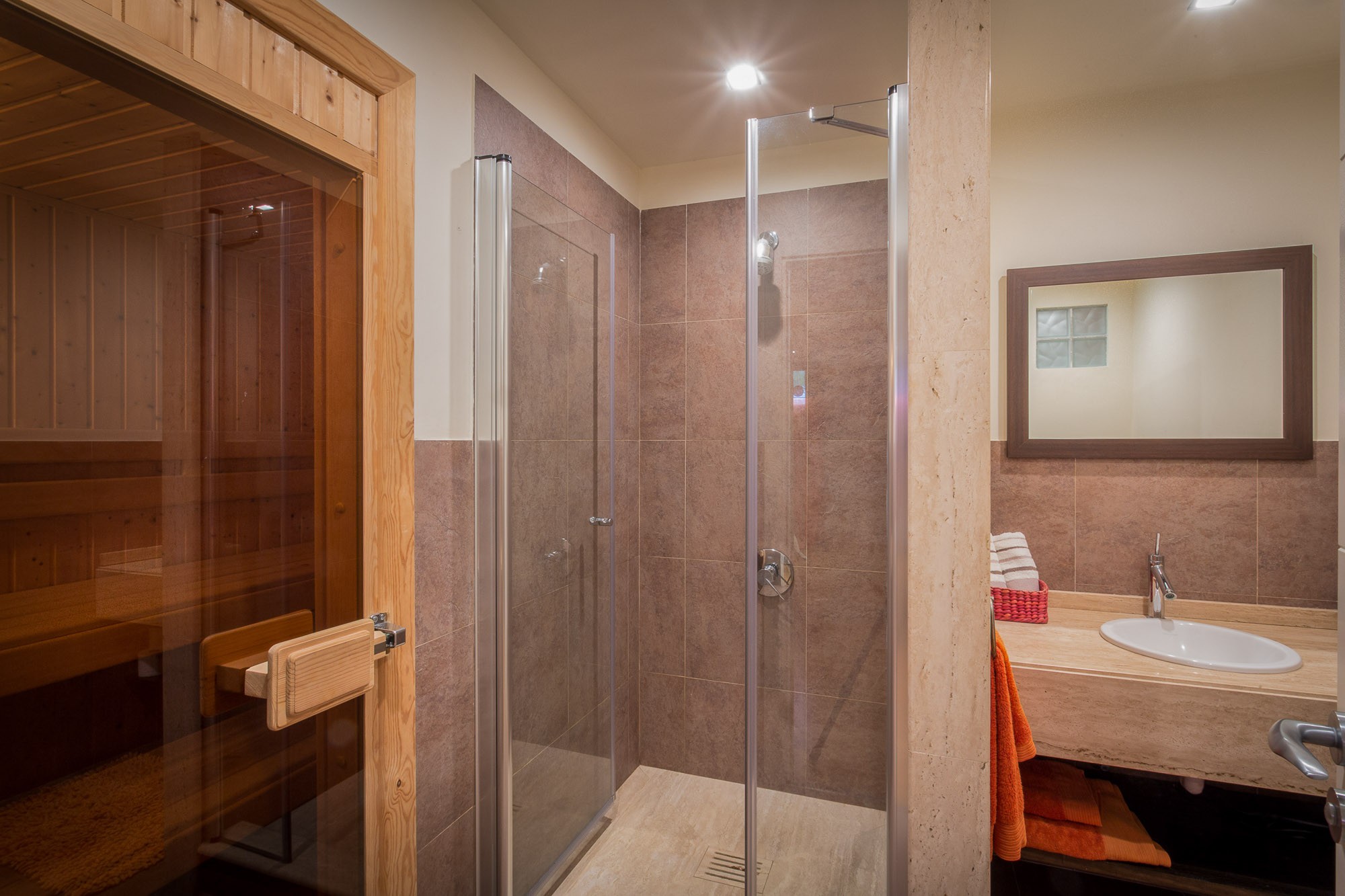 The ground floor bedroom is ideal for children, as there are twin beds plus a sofa-bed which could accommodate another child. There’s a further den-like basement bedroom which also has a sofa bed, as well as a sauna.