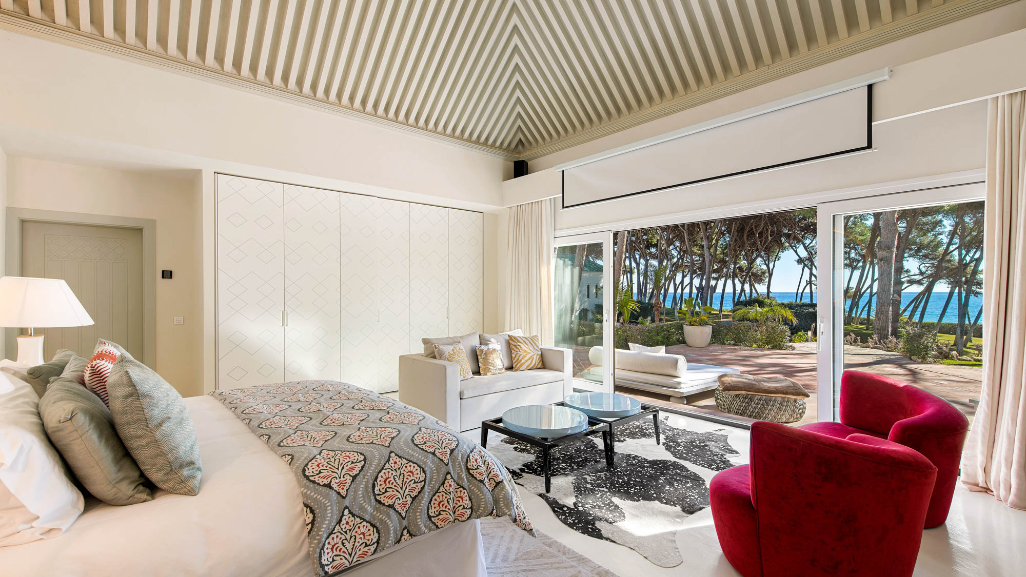 Guest House Bedroom 9: Second bedroom in guesthouse. Recently upgraded, stylish family suite with large principal bedroom featuring King-Sized bed (200cm x 200cm) and projector and TV. Lounge area with two red velvet armchairs and ornate vaulted ceiling, plus walk-in wardrobe. Sliding doors revealing views of pool, sea and gardens. Separate annexe with fridge, sofa, and wall-mounted TV and separate bathroom with walk-in shower and WC.